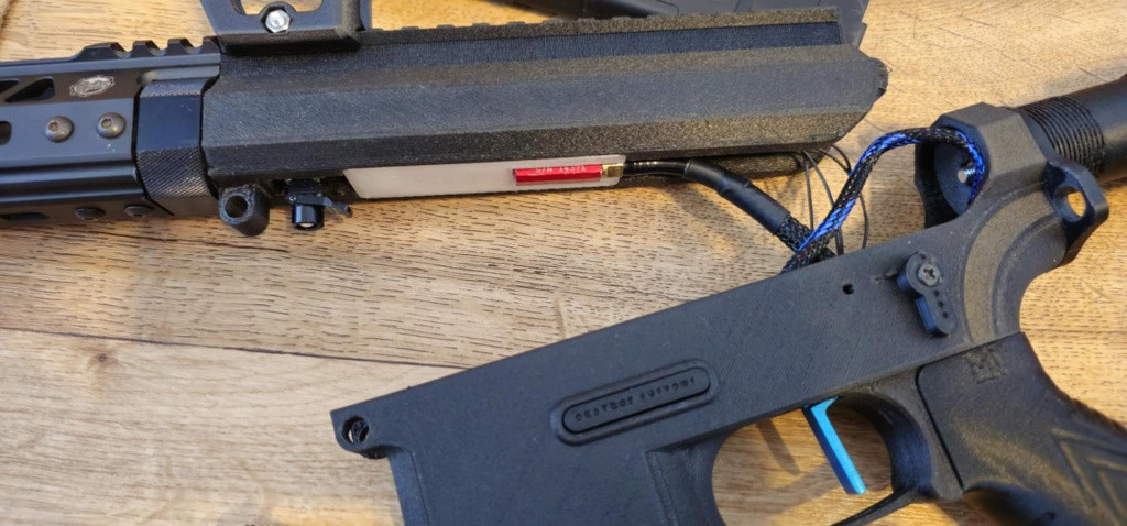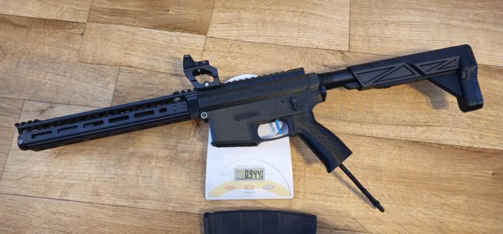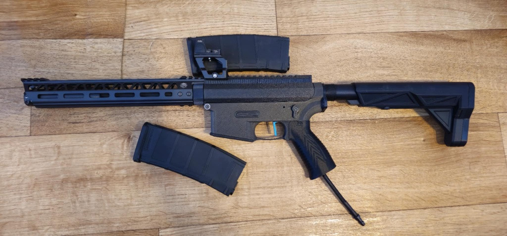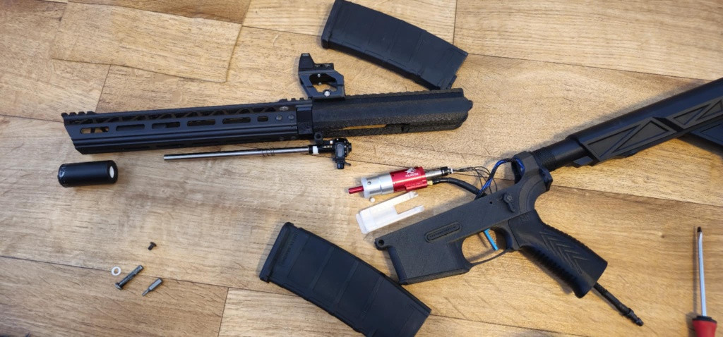 PRODAM svou na miru stavenou z velke casti 3D tistenou AR15 ktera bez zasobniku nevazi ani 1Kg. Na telo je pouzity odolny material PA12 CF15 s karbonovymi vlakny. Cela zbran je stavena tak aby byla co nejlehci a dokonale v ose, proto nema mechabox ale pouze maly triger box na spinaci jednotku, system F2 je usazen primo v upperu zbrane s komorou od Maxx pro GBB gumky a hlavne. Zbran je stavena na vysokou vahu kulicek jiz od nizkych vykonu, ale zvladne i nejlehci kulicky pro hry CQB.. kratka 20cm hlaven zajistuje dostatecnou variabilitu vykonu pro CQB hry tak pro venkovni hry. V extremne lehkem hlinikovem predpazvi od Retroarms se tedy schovava kratka hlaven na niz navazuje mensi na miru delany moderator hluku pro upravu zvuku vystrelu a dokonce se tam vlezl i maly nasvetlovaci tlumic ktery umi nasvetlit i cervene kulicky. Cela zbran je kompaktni a lehka pro dobrou manipulaci. Ke zbrani dodam 2 zasobniky Delta armory ktere do zbrane dokonale sedi. V cene je i nasvetlovaci tlumic a bohuzel praskly kolimator. Cena pevna 22 000 Kc a nemenim