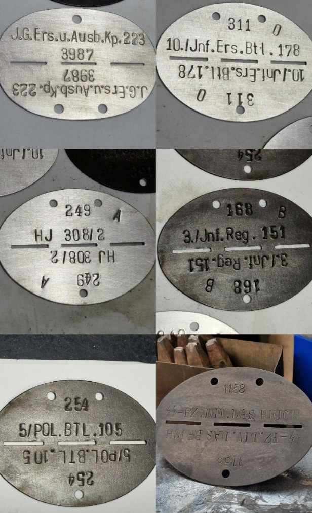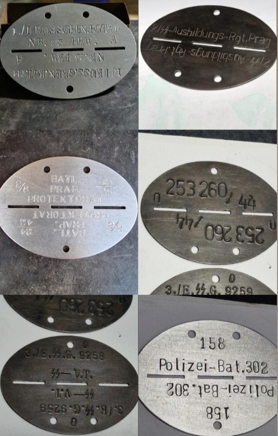 Prodám repro německých ID známek. Na výběr mám dva tvary znamek viz. obr.č2 Material známek hliníkové, zinkové, zinkové- černěné, nerezové, ocelové. Cena za kus hliník 50kč Cena za kus ostatni mat. 80kč Dále mohu nabídnout ražba dle přání. Náhled ražby viz. obr. Ideálně vyplnit přesný vzor Vašeho text viz.obr.č6 nebo přiložit originální znamku s Vaší úpravou. Abych se mohl, co nejblíže přiblížit Vaší představě. V případě jakýchkoliv otázek pište, rád odpovím a dohodnem se. Cena se známkou + ražba 200-250kč dle složitosti. Tgs: známka , ID známky , wehrmacht , luftwaffe , fallschirmjager , ID známka , Ražba , waffen, identifikační známka, erkennungsmarke, Fallschirmjäger