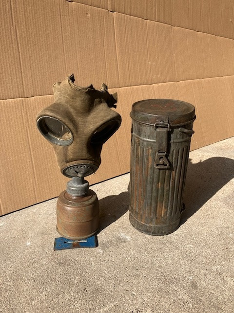 Nabízím k prodeji německou plynovou masku z 2. světové války s filtrem a plechovým pouzdrem. Nálezový stav z půdy (objevena při opravě střechy).