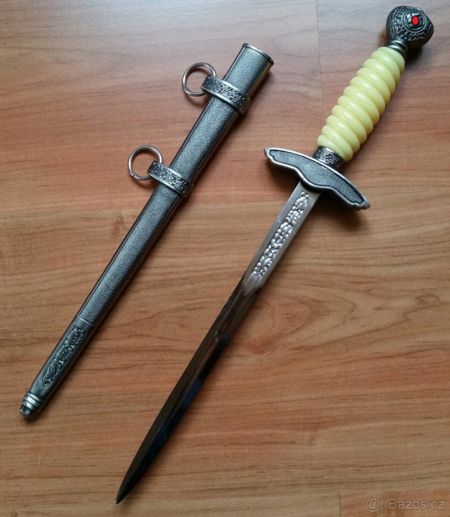 Prodám sběratelům válečných věcí tuto repliku německého kordíku pro důstojíky letectva (Luftwaffe) od roku 1937,je i s pouzdrem.Při dneštních cenách originálních kousků,je tato cenově dostupná varianta rozumným řešením a dýka určitě ve sbírce neudělá ostudu a je moc pěkná ve vitrýnce.Rozměry d = 38 cm, čepel 24 cm.Stav je jako nový.Výrobce už ho přestal vyrábět,tudíž jedinečná možnost ho ještě zakoupit.Třeba se někomu hodí do sbírky.Nabídky prosím pouze na e-mail.Děkuji. Určeno výhradně pro sběratelské účely. Nikoliv k propagaci extremistických hnutí a ideologií, jenž vedou k potlačení lidských práv a svobod jednotlivce či skupiny obyvatel.