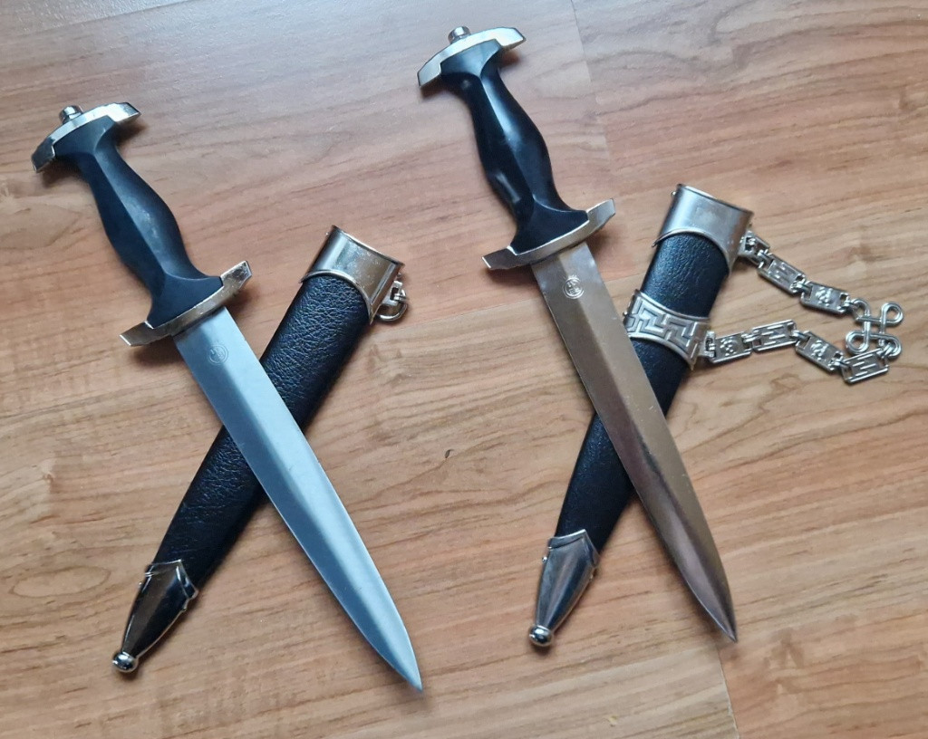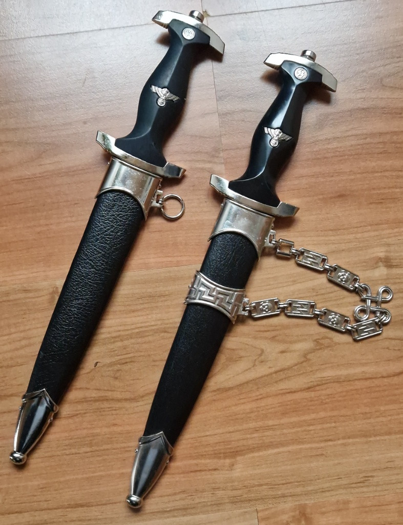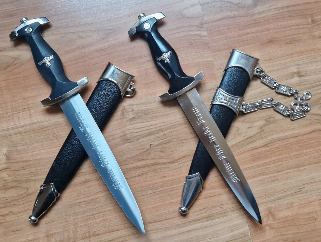 Prodám sběratelům válečných věcí tuto repliku německé dýky pro jednotky SS.Při dneštních cenách originálních kousků,je tato cenově dostupná varianta rozumným řešením a dýka určitě ve sbírce neudělá ostudu a je moc pěkná ve vitrýnce.Stav je jako nová.Nápis na čepeli Meine Ehre Heist Treue - Mou ctí je věrnost. Zezadu značení RZM.Třeba se někomu hodí do sbírky.Mám v nabídce dva druhy,řetězovou verzi pro vyšší důstojníky ss a bez řetězu pro nižší důstojnictvo a vojáky ss.Vyberte si jaká se líbí.Možno obě, nebo jednotlivě dle výběru. Cena by byla za dýku bez řetězu 2000 kč a ta řetězová 2200 kč. Upozornění: Toto je určeno pro sběratele, studium historie nebo pro reenaktory. V žádném případě nesmí být zneužito k propagaci fašismu nebo jiného hnutí směřujícímu k potlačení práv a svobod člověka.