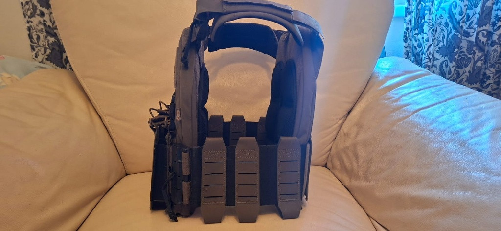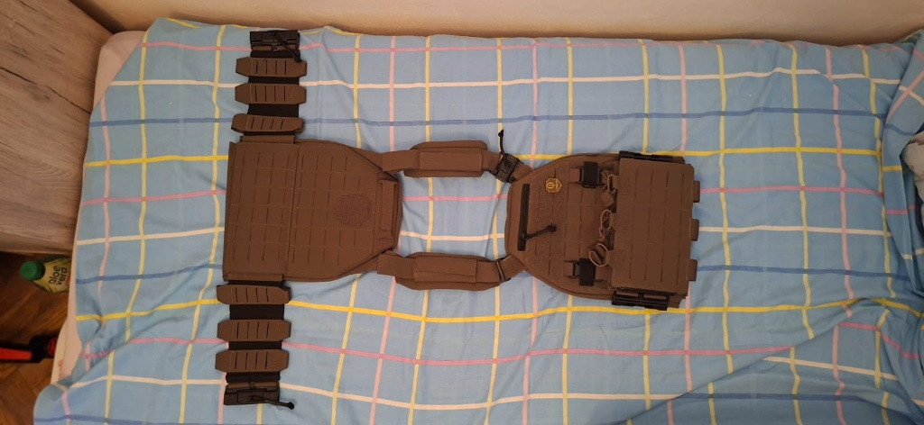 Nový, nepoužitý nosič plátů na airsoft. Nosič plátů má integrované dvě repliky SAPI plátů v rozměrech 31,6 cm X 24,8 cm (výška x šířka) které odpovídají velikosti M. Na přední straně se nachází tři sumky pro M4/AK/G36 zásobníky, na každé straně bočních panelů naleznete tři integrované sumky, celkem 2 pro pistolové zásobníky a 4 pro vysílačku nebo M4 zásobník. Také mám tašku ve kterém byl doručen.