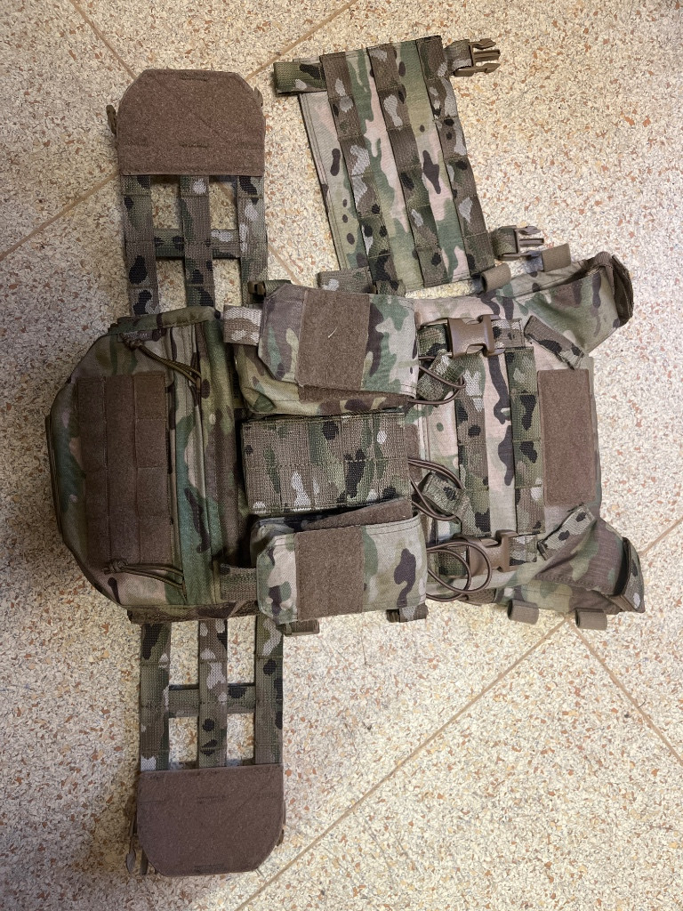 Prodám nosič plátů, vel. M. Součástí je panel se 3 sumkami na zásobníky do dlouhé a 2 sumkami na zip, molle velcro panel a drop down. Nosič je bez balistických plátů, jeví minimální známky používání.