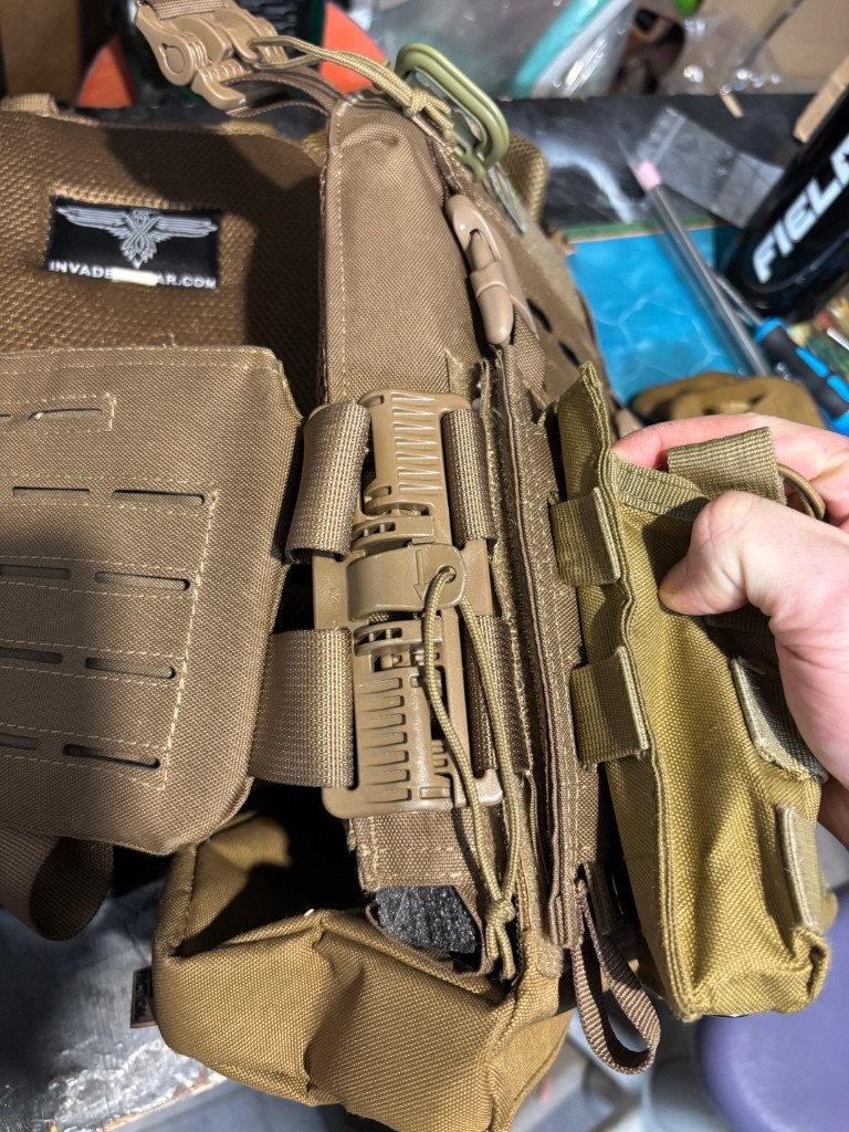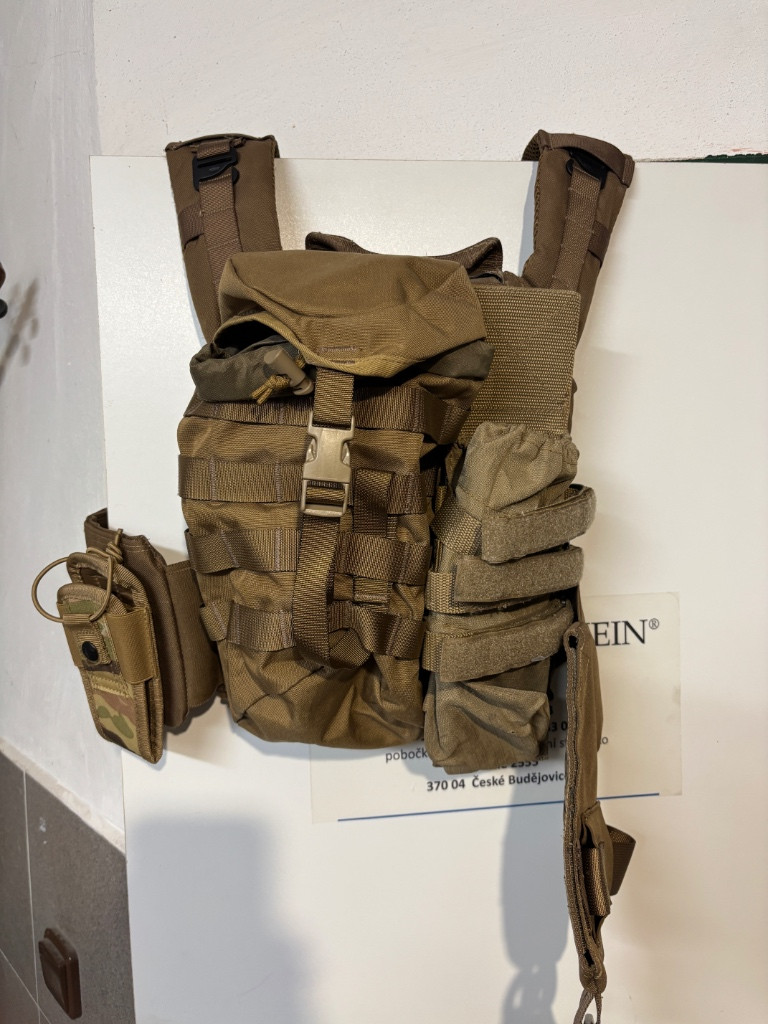 Invader gear reaper qrb nosič plátů v barvě TAN. Rychloupínací spony pro jednoduché oblékání. Osazený: přední panel 3 sumky ar15, admin pouch pod nosičem, sumka na vysílačku, přídavná kapsa 5L na zádech, nosič HPA lahve. Mohu přidat doplňkové ramenní vycpávky. Při rychlém jednání možná sleva. Posílám zásilkovnou na dobírku. Popřípadě osobní odběr. (Jezdím trasy ČB, Tábor, Praha.) Pište SMS.