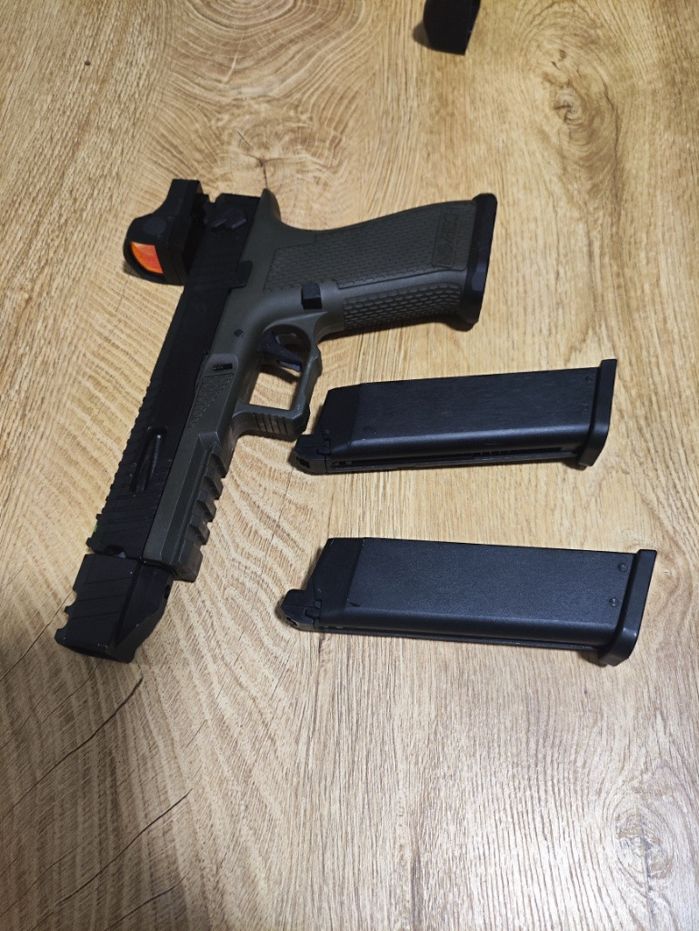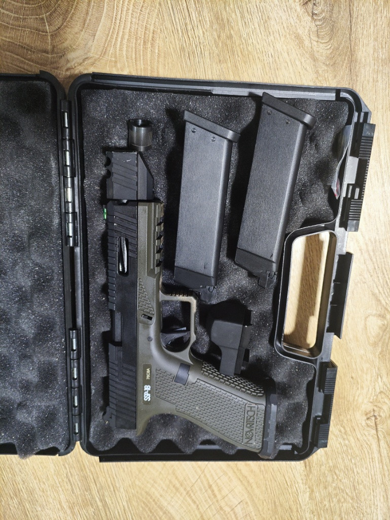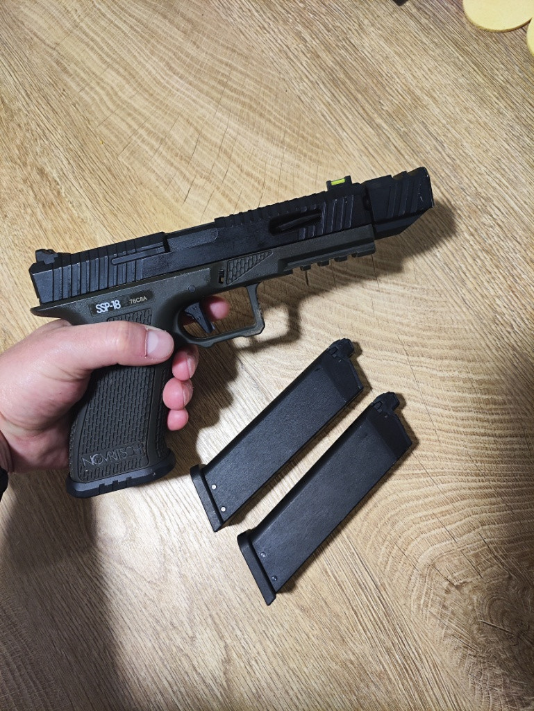 Nabízím k prodeji SSP 18 provedení Green. Jedná se o moderní provedení Glock 18 s možností full-auto střelby. Zvládá v pohodě Gren/Red/Black Gas. Ke zbrani jsou dva zásobníky na plyn, kompenzator, magwell a kolimator V2 s platem na připevnění, klíček na dotahování ventilů zásobníků a origo kufřík. Zbraň byla na 5 akcích. Vystříleno cca 10 zásobníků. Vždy po akci vyčištěná a promazána. V případě zájmu přidám i holster za 200. Při rychlém jednání sleva! Pořizovací cena 8900 na podzim 2024.