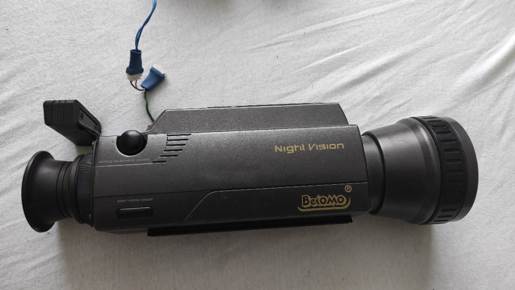 Starší pozorovací noční vidění bez záměrného kříže. Roky nepoužívané, po domácku doděláváný červený přísvit. K napájení byla používána Li-Pol baterie z airsoftových zbraní, nemám už žádnou na vyzkoušení. Cena k jednání.
