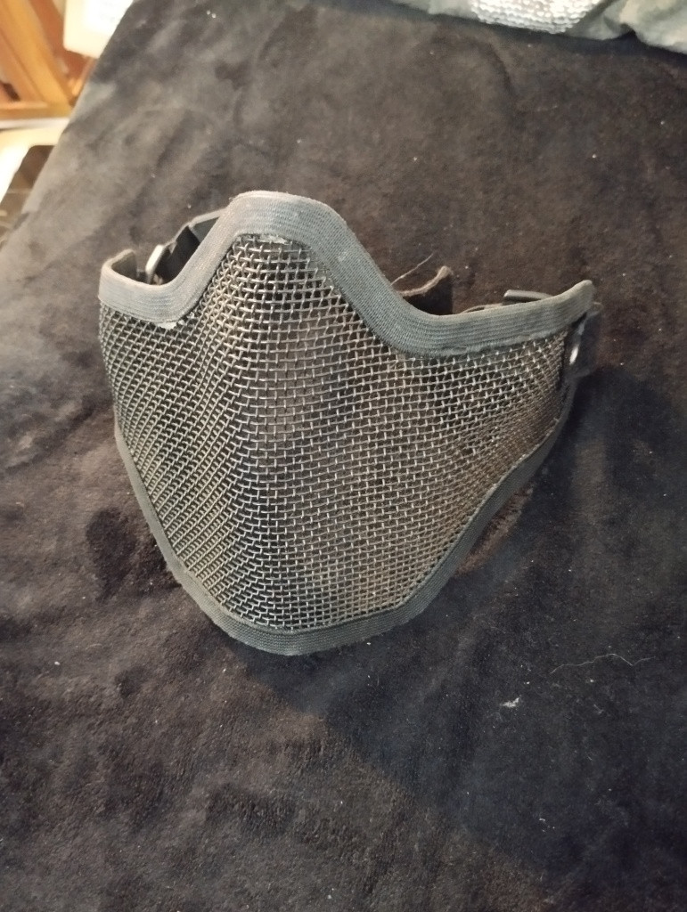 Černá ochranná maska na obličej na airsoft. K tomu ještě černá kšiltovka, na ni jsou suché zipy na různé nášivky atd.Posílám přes zásilkovnu.
