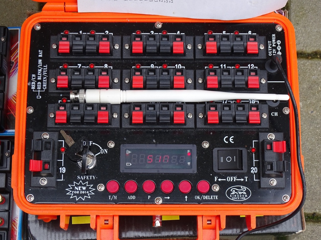 20 kanálový odpalovací systém KFE2204D na 433Mhz kódováno Vnitřní akumulátor 12V/1,4Ah Dosah cca 250m, reálně testováno na 100-150m. Zapalovací výkon 24V/5A.Funkce test a pal s bezpečnostním klíčkem. Možno nastavit časy od 10ms po 9minut 99sekund a 99setin. Tzn 0,01-9,99,99. Možno nastavit singl - stisknutí daného čísla tlačítka DO - daný odpal na strojku. Funkce krok – po každém stisknutí tlačítka DO- STEP jde jeden odpal po řadě za druhým č.1-20. Funkce sekvence nastavení času mezi jednotlivými odpaly pro všechny stejně. Spuštění tlačítkem na DO- CONT. Funkce dynamická sekvence možnost nastavit na jednotlivé odpaly různé časy. Funguje tak že odpal č.1 je vždy 0s okamžitě a pak + nastavený čas +nastavený čas atd. Tzn časy se vždy přičítají tak jak jdou za sebou odpal č.1-20 Spouští se tlačítkem na DO-CONT. Sekvencer (krokový modul) KFE2213 Provoz na 2x9V baterie nebo externí napájení 12-24V Odpalovací napětí – signální od 8,5V do 36V. Zapalovací výkon 18V/2,5A Testováno na 5 palníků v sérii na 1 výstup o celkovém odporu 6,5 ohmů Fukce test a pal. Možnost nastavit volitelně funce : všechny najednou, postupně jeden za druhým po stejném čase a jeden za druhým s volitelnými časy od 0,01 do 9,99 sekundy.Přes výstup č.11 ovládá další sekvencer. + 93 SO palníků o délce 2m.