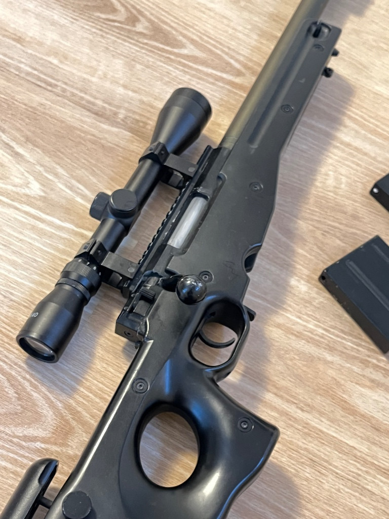 Odstřelovací puška se Zaměřovačem, dvěma zásobníky a maskovacím pouzdrem na hlaveň.