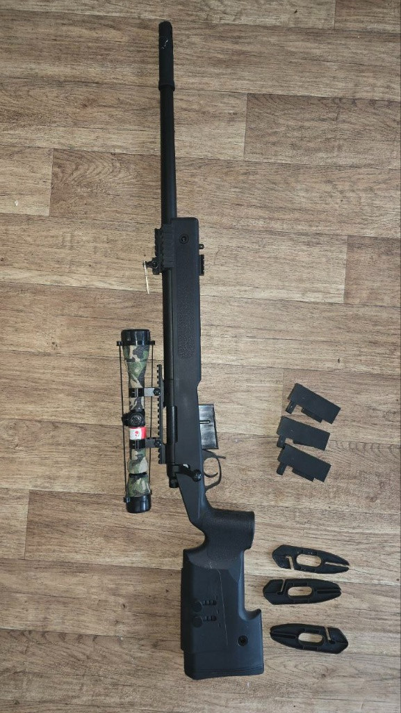 Prodám odstřelovací pušku od firmy Specna Arms, plně funkční. Má výkon přibližně 1,5 joulu, nic nebylo měněno. Pokud se provede upgrade, bude to velmi dobrá puška. Prodávám z důvodu, že mě více baví hrát s automatickými zbraněmi a tato mi jen leží doma. Z nedostatků pouze kosmetické vady a chybí jeden šroub pro nastavení lícnice na pažbě.
