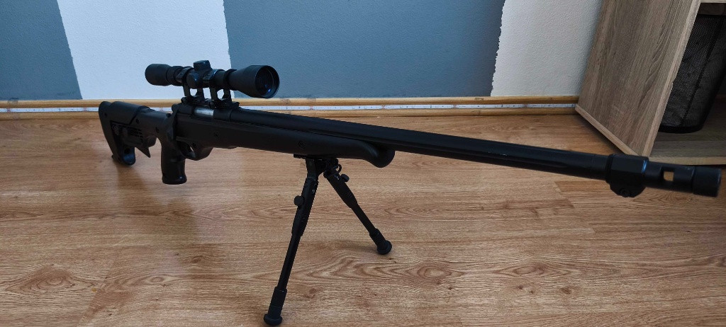 Ahoj, prodám manuální sniperku VSR 12 s optikou 3x9-40, dvojnožkou a zásobníkem. Snipa je osazená ris lištama a polohovací pažbou. Úsťová rychlost 470 FPS. Naměřený výkon cca 2,1 - 2,2 Joule. Stav: Snipa je ve velmi dobrém stavu, plně funkční, pravidelně čištěná. Díky dlouhé vnitřní hlavni má velmi dobrou přesnost. Doporučuji používat kvalitní střelivo o váze 0,32g – 0,40g pro nejlepší výsledky. Cena 1950Kč + doprava, při rychlém jednání možná sleva Platí do smazání