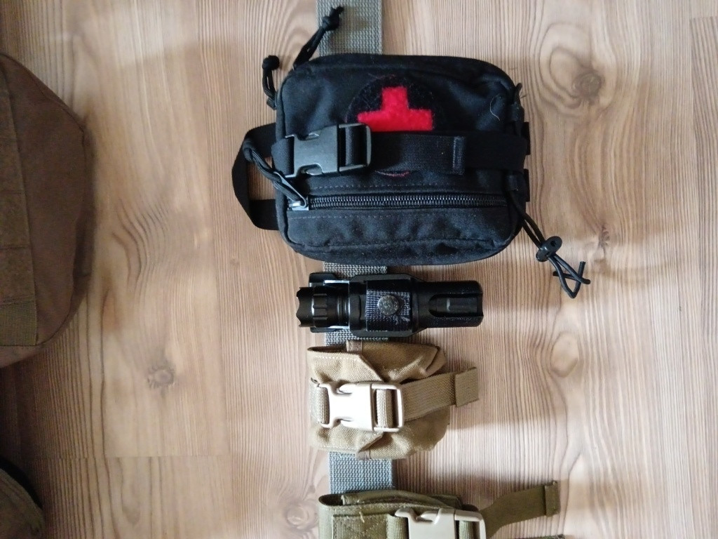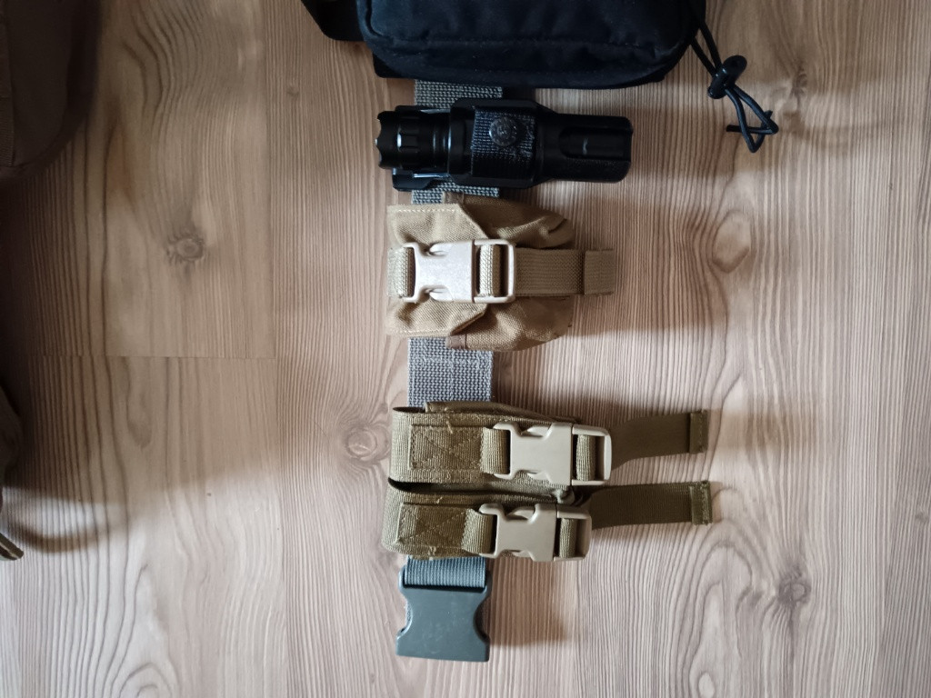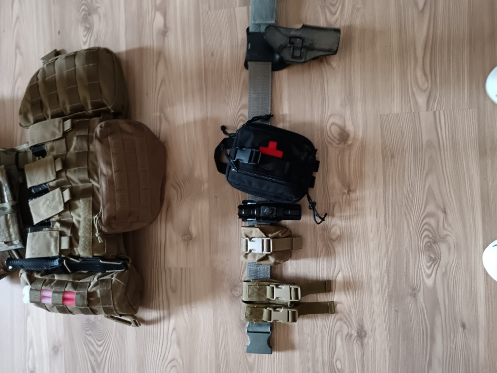 Opasek se sunkami a pouzdrem na G19( je k tomu plně funkční v plynu),batoh EDC materiál Cordura-štítek jsem odstranil,tak si nepamatuji výrobce. Emerson Gear to není,je to kvalitní batoh. Původní cena byla okolo 3000 Kč)cena k jednání za opasek bez baterky je 1000 Kč a za batoh také 1000 Kč