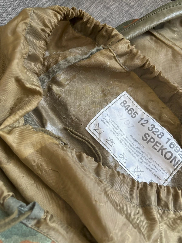 Originální vojenský batoh z 90. let v maskovacím vzoru flecktarn. I přes svůj věk je zvenčí v perfektním stavu, bez poškození a stále si drží pěkné barvy. Zevnitř má na stahovacím vaku, který kryje hlavní komoru batohu, částečně slezlé pogumování, ale při používání to ničemu nevadí. Pogumování se ani dále nedrolí. Ve stejném materiálu lze také najít malou dírku, hned vedle hliníkové výztuhy. Až na drobné nedostatky jde ale o kvalitní a extrémně odolný batoh, který vydrží spustu dalších let používání. Možné zaslání poštou nebo osobní předání v Praze.