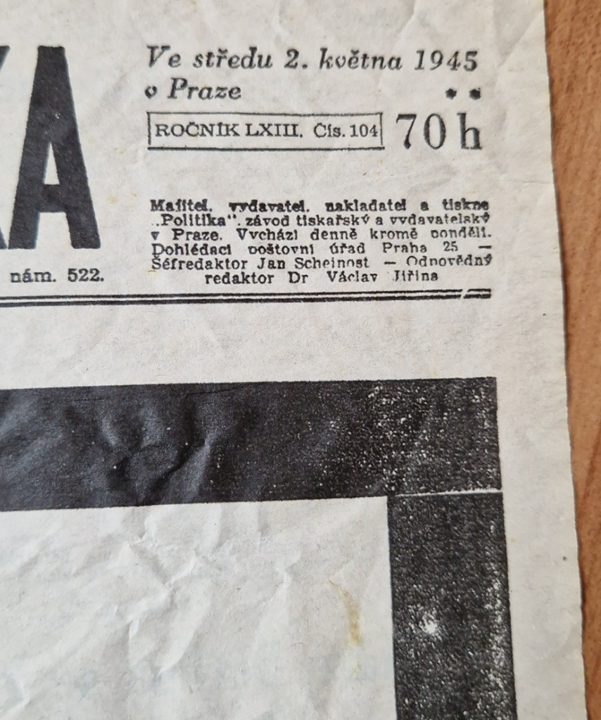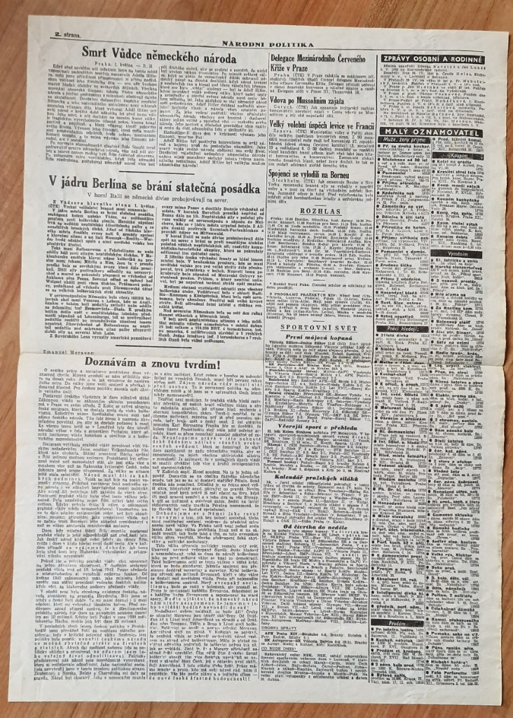 Prodám tyto raritní,originální,už málo vídané noviny Lidové listy s titulkem Vůdce padl,z 2.května 1945. Poslední lež propagandy Třetí říše,kde se tvrdilo,že Hitler padl v hrdinském boji.Málo vídaný a hodně ceněný výtisk,pro sběratele militárií a německých věcí ww2.Jedná se pouze o jednolist - takto to bylo k této události vydáno.Za originalitu novin ručím vrácením peněz.Cenu nabídněte pouze na e-mail.Děkuji. Alternativní investice v podobě investování do originálních sběratelských předmětů je jistým bezpečným přístavem pro Vaše finance, jelikož v tomto oboru se snoubí historická hodnota sběratelského předmětu, jeho omezené množství a neutuchající poptávka z řad dalších sběratelů a investorů. Upozornění: Toto je určeno pro sběratele, studium historie nebo pro reenaktory. V žádném případě nesmí být zneužito k propagaci fašismu nebo jiného hnutí směřujícímu k potlačení práv a svobod člověka.