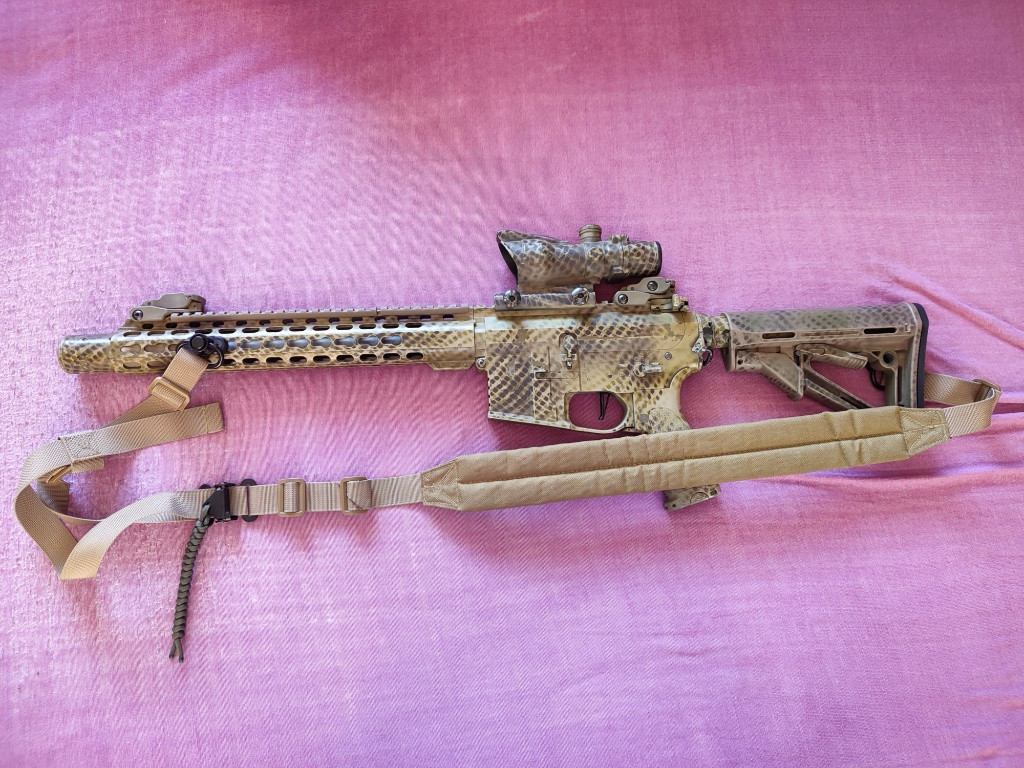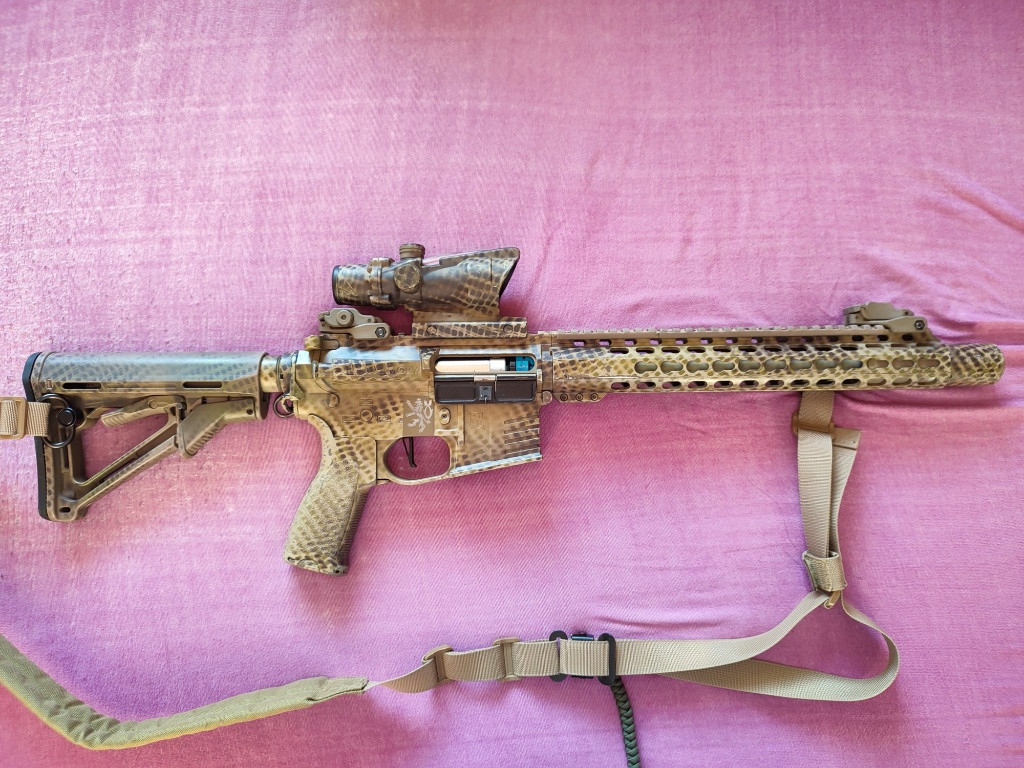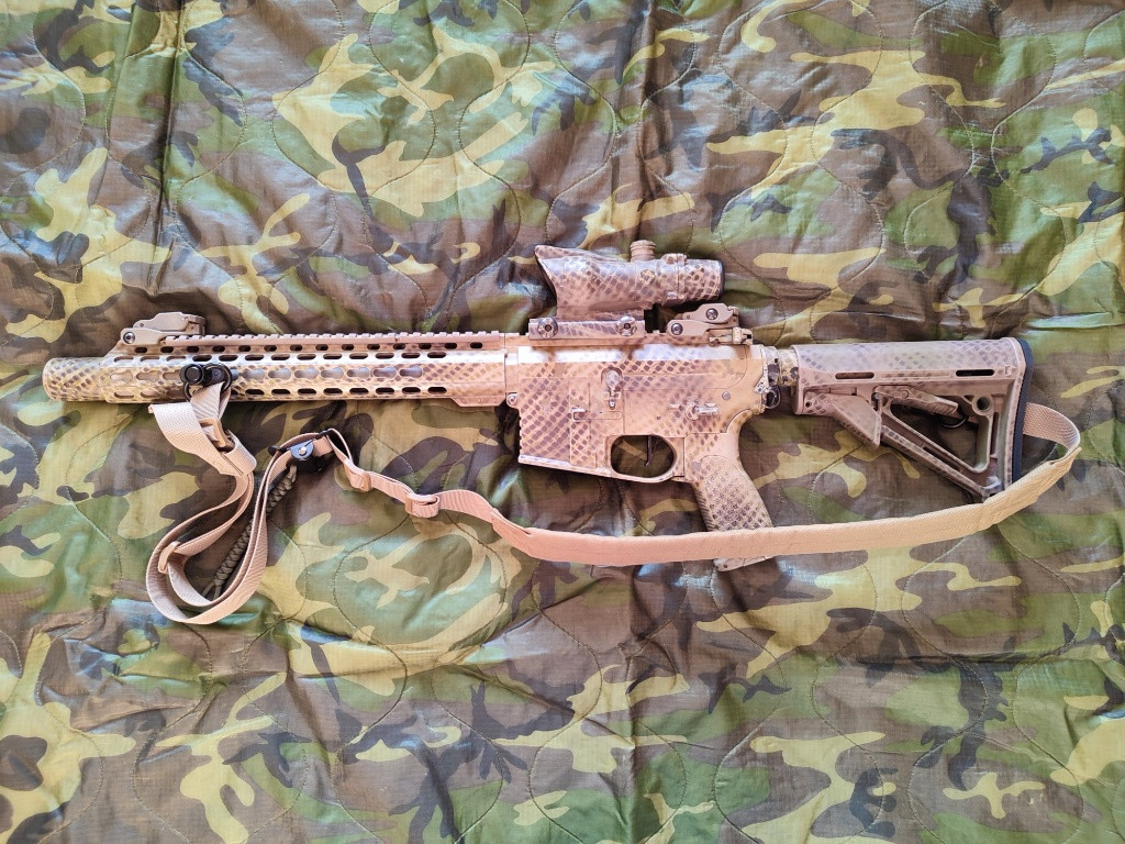 Prodám M4 od Delta Armory, verze SilentOps Alpha - celokov. Puška sloužila jako náhradní, původně TAN barva, nástřik proveden krylonem. Ve zbrani je následující upgrade: - Přesná hlaveň Maple Leaf 6,02 363mm - až na konec tlumiče - Prowin hopkomora - 4uantum guma+přítlak - Nová pružina Guarder SP120 - Nová kabeláž s T-Dean konektorem - Perun mosfet - T238 bezuhlíkový motor - SHS hlava válce a pístu - CNC tryska s těsněním - Původní ošklivá pažba nahrazena pažbou CTR - Oko na popruh je vyměněno za typ Magpul ASAP - Dvoubodový popruh Hlaveň je v tlumiči fixována centrovací vložkou od Retroarms. Kola jsou přepodložena, vše promazáno, komora doražená pomocí O-kroužků. vzduchotechnika utěsněná, viz poslední foto. Původní ručku na předpažbí přidám, stejně tak očko na popruh. Aktuálně 1,75J s 0,3g kuličkami na SP120 od Guarderu. Naprosto bezproblémový kvér, stačí připojit baterku a vyrazit do hry. Prodávám, protože toho mám prostě moc. Cena je bez ACOG, v případě zájmu plus 1.000,- Kč, s původním motorem 5.500,- Kč. Osobní předání Hořovice a okolí nebo nějaká akce.