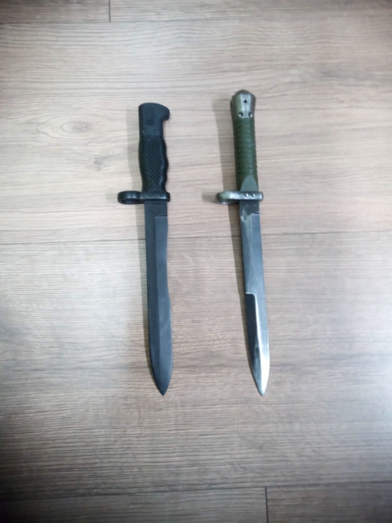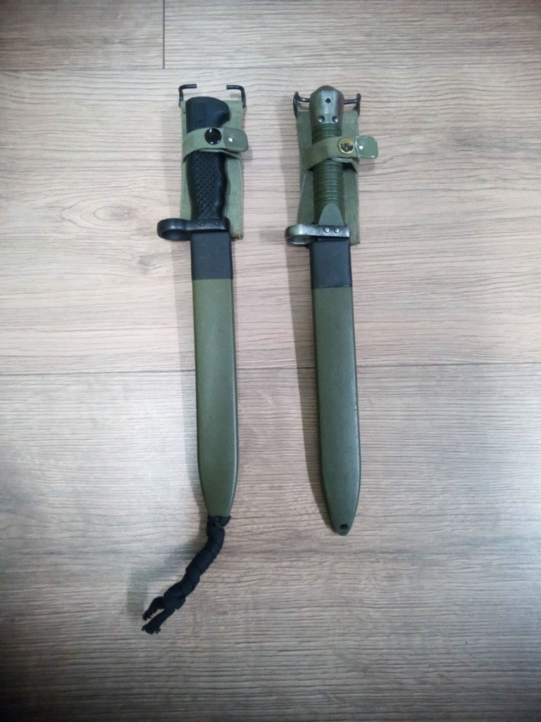 Prodám španělské bodáky CETME. Model CETME C/FR8 je nepoužitá uloženka, cena 1.600,- Kč. Model CETME L je v použitém, ale dobrém stavu, cena 400,- Kč. Pěkné značení na čepelích, cena při koupi obou bodáků 1.700,- Kč.