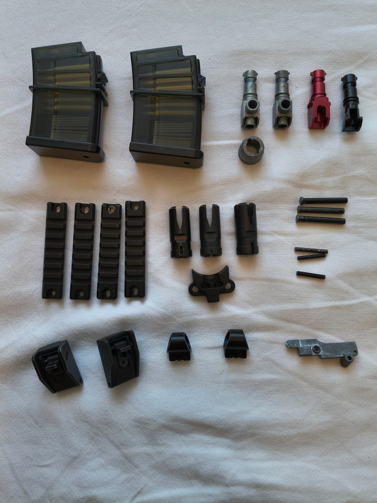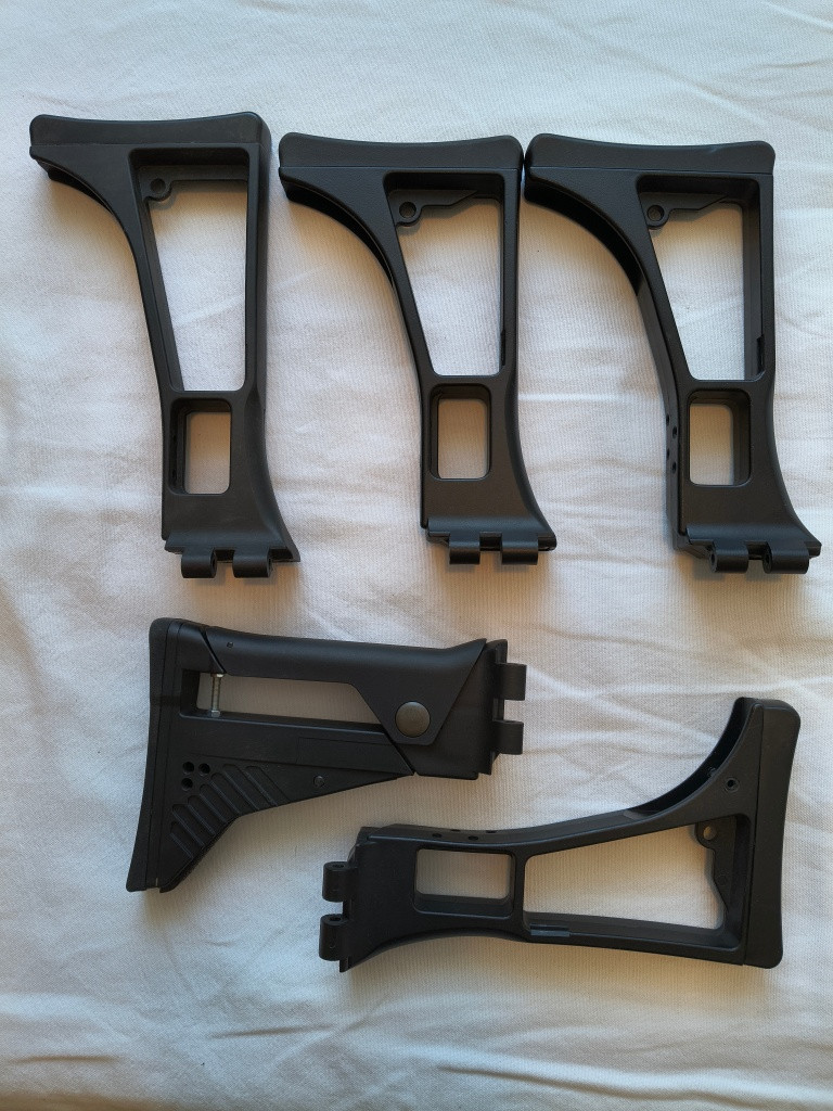 Prodám tyto přebytky dílů. Pažby 3x G36C, 1x G36K, 1x G36IDZ (s dodělanou příčkou na popruh). 2x zásobník (střední délka) + drobné díly. Výrobci různí.
