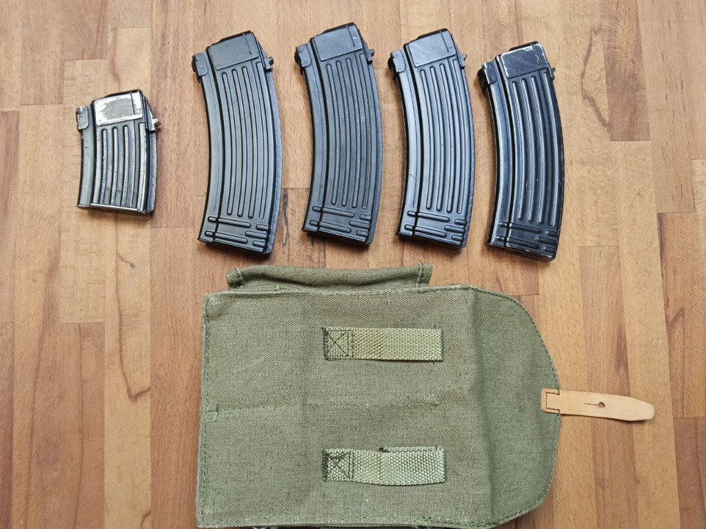 Nabízím sumku a plechové zásobníky původně pro polský Tantal, ale i pro jiné pušky typu AK74. 3x nové, 1x použitý, 1x krátký použitý na 10 nábojů. Jeden ze zásobníků má značení "KT100", což není obvyklé pro polské plecháče. Cena za celek.