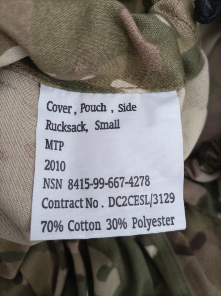 COVER, POUCH SIDE RUCKSACK, SMALL. MTP NSN: 8415-99-667-4278 Ochranný povlak / nepromokavý obal / maskovací převlek na batohy do objemu cca 45 litrů Pevný a odolný polybavlněný materiál Pochází z výstroje britské armády Nové zboží Barva: vícebarevné multifunkční maskování Multi-Terrain Pattern (MTP) Materiál: 70% bavlna, 30% polyester Údržba: praní 40°C Hmotnost: cca 275g Armádní originál Zasílám přes dopravce Zásilkovna. ČR na výdejní místo 95,-Kč ČR na adresu 135,-Kč SK na výdejní místo 105,-Kč SK na adresu 175,-Kč Zaslání dobírkou neposkytuji. Platba předem na účet.