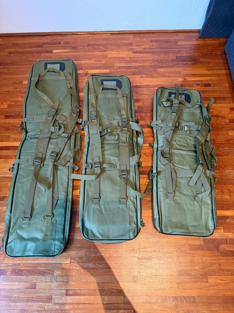 Prodám nepoužitá pouzdra na zbraně. Všechny úplně nové. Pouzdra jsou vybavené polstrováním, popruhy pro přenášení v ruce i na zádech, sumky na vybavení a uvnitř popruhy pro fixaci zbraní. CENA 400/500/600Kč dle délek.