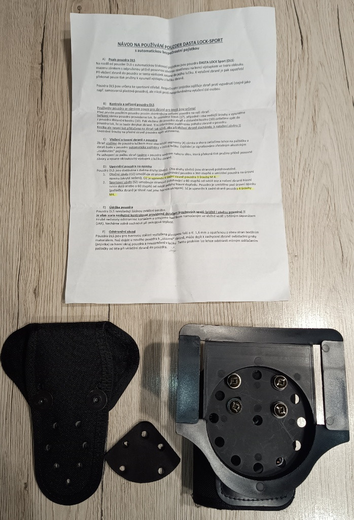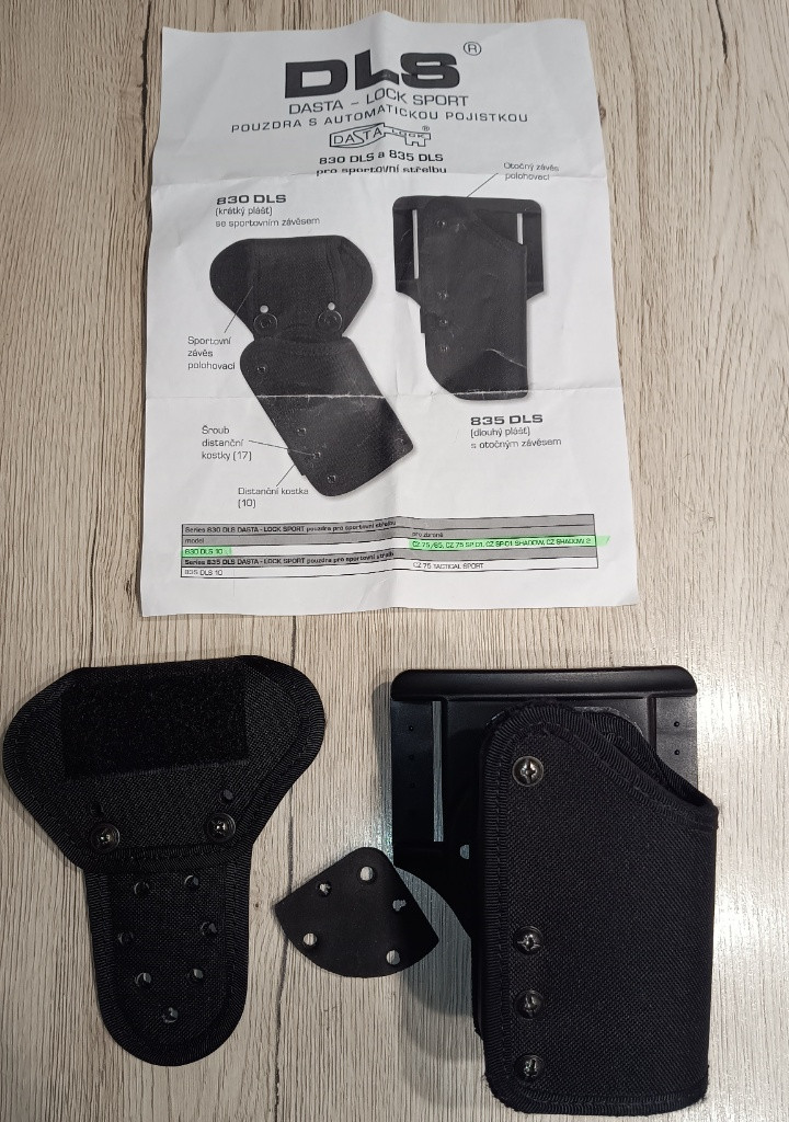 Pouzdro na pistoli DASTA model DLS 830 10 (krátký plášť) pro zbraně CZ75/85, CZ75 SP01, CZ SP01 Shadow, CZ Shadow 2. ++++ Pouzdro s automatickou bezpečnostní pojistkou - odpružený výstupek ve tvaru oblouku (zapadající do lučíku zbraně). K zasunutí a tasení zbraně u DLS pouzder je třeba pouze silou překonat tlak pružiny. K pouzdru jsou dva typy polohovatelného závěsu pro nošení v ose opasku a pod opaskem. Lze nastavit sklon. Pouzdro nese lehké známky používání a úprav závěsu, viz fotky. ***** Cena je bez poštovného - zasílám přes službu Zásilkovna. Poštovné na pobočku Zásilkovny 89 Kč, doručení na adresu 129 Kč, při využití dobírky poštovné +26 Kč.