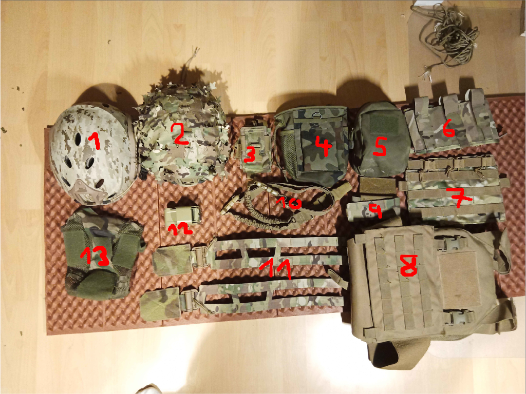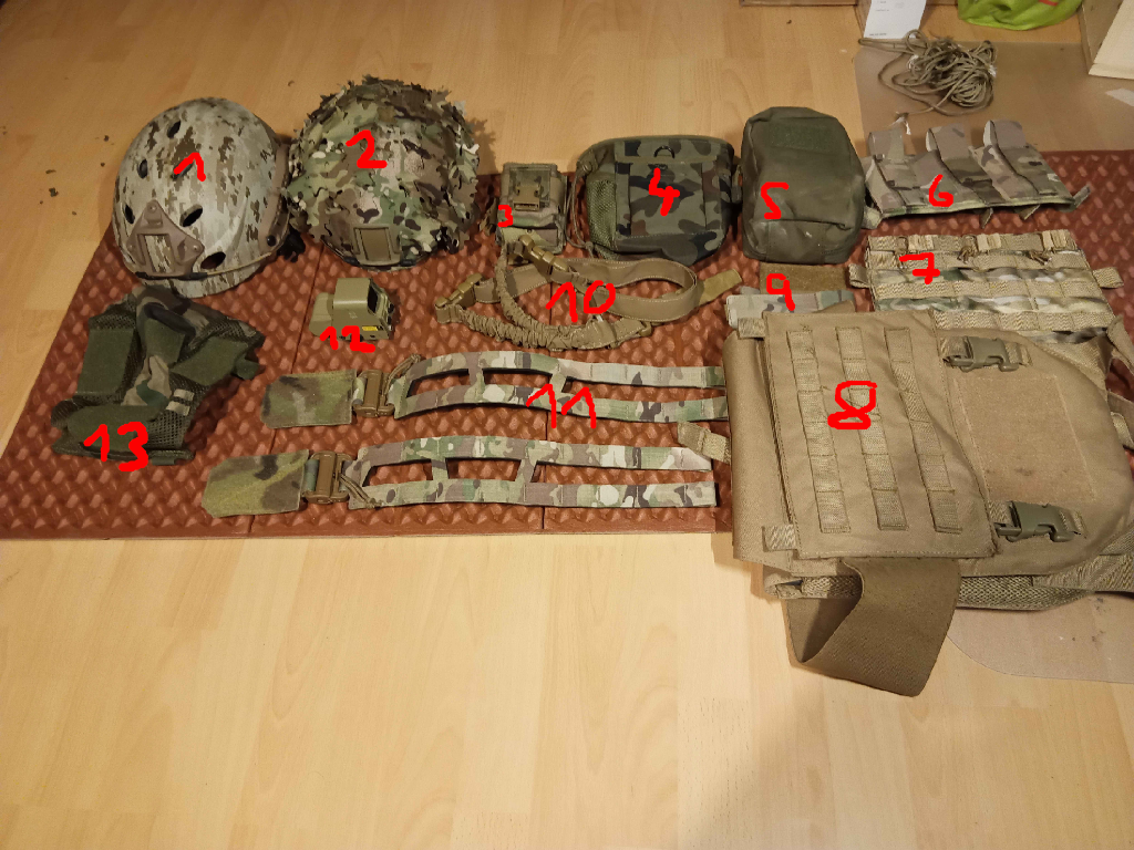 Jsem ochoten se domluvit na ceně u většiny věcí. 1- FMA fast helma digital desert (500kč) 2- Helma fast PJ emerson s multicam 3D potahem (400kč) 3- Multicam sumka na vysílačku (500kč) 4- Flecktarn odhazovák (100kč) 5- Olivový admin pouch (300kč) 6- Wosport multicam elastická sumka na M4 zásobníky (300kč) 7- Wosport molle panel (100kč) 8- Nosič plátu s elastickými boky, coyote, imitace plátů (500kč) 9- Multicam sumka na turniket (150kč) 10- Bungee jednobodvý popruh (150kč) 11- Multicam skeleton cummberbandy (800kč) 12- Coyote eotech XTO, theta optics (600kč) 13- Woodland potah na helmu fast (100kč)