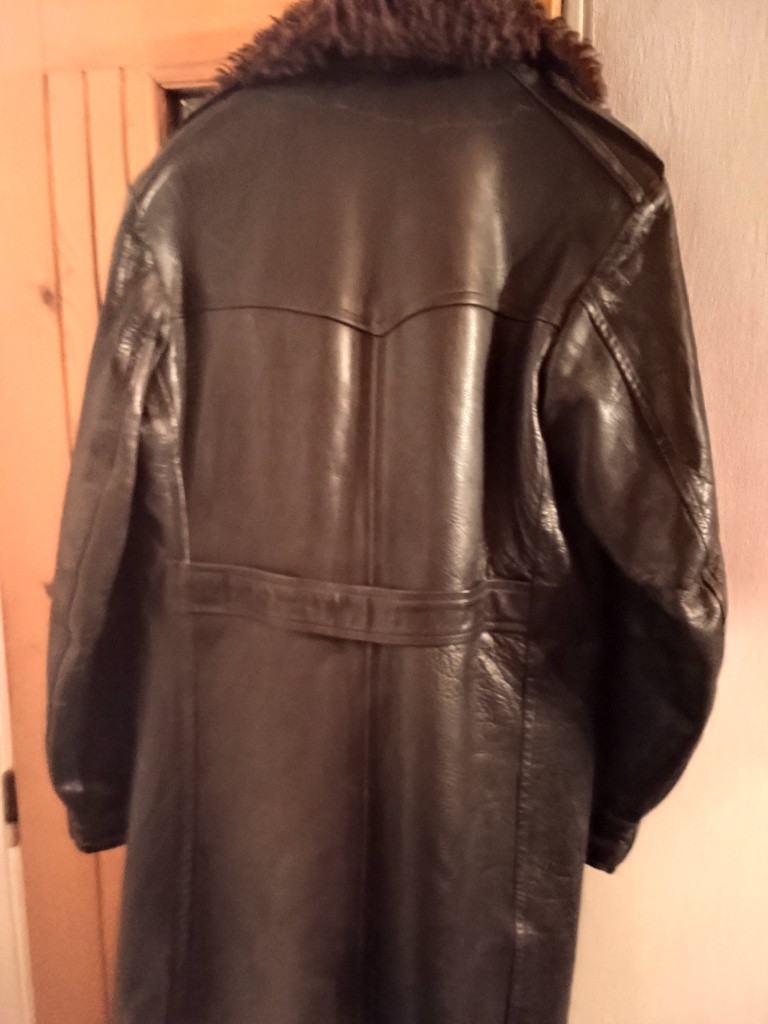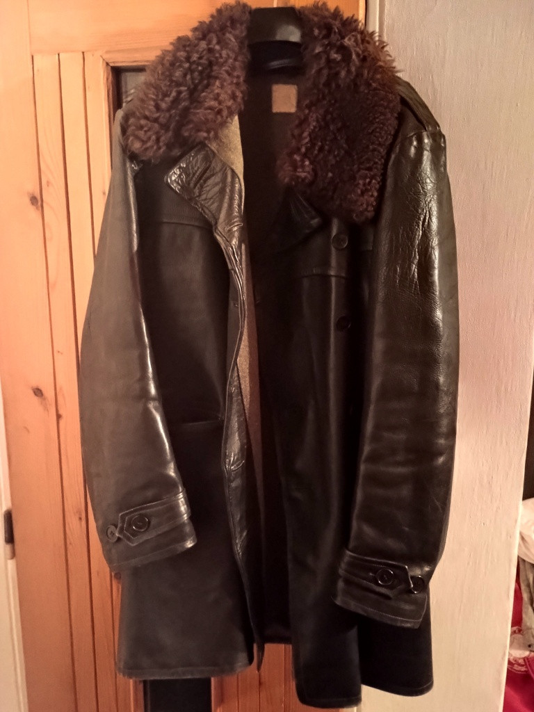 This is a Swedish officer's coat from WWII. Horse hide leather coat in black/brown with an army green wool lining. Double breasted front, full collar.... Perfect condition...
