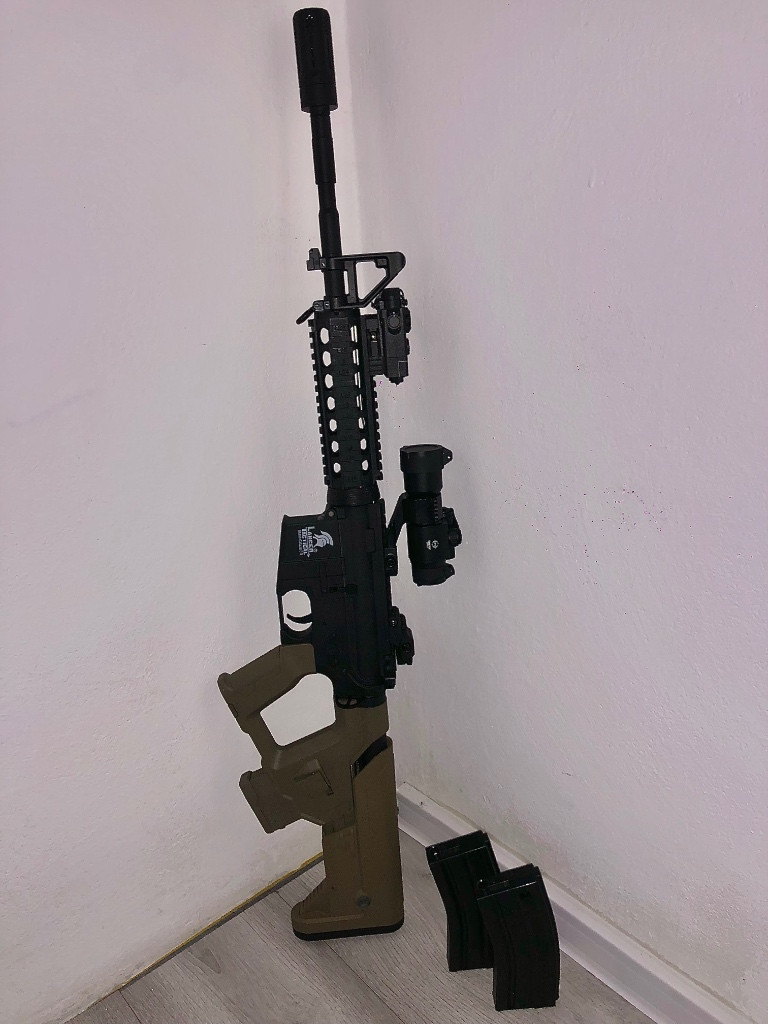 Zdravím, prodam jednu ze svých airsoft zbrani od firmy Lancer Tactical, základní pružina M100 (přidám samozřejmě zabalenou M120) díky upravené pažbě není možná rychlovýměna. Vnitřek je kov a typ vnitřností Gen 2, zbraň je spíše pro začátečníky nebo i pokročilé hráče. Mám na ní tubusovy kolimator v hodnotě 1500,- a tlumič Smokey Wolf krátký, který napodobuje výšleh a kouř v různých modech v hodnotě 3500,-, 2x kovový tlačný zásobník a 1x kovový točák na cca 300bb. Bud prodám komplet za 7k a nebo odstrojenou zbraň za 4k. Na prodej nespěchám. Mám další dvě zbraně, takže tuto třetí už nevyužiji a bylo s ni hráno jen 3x.