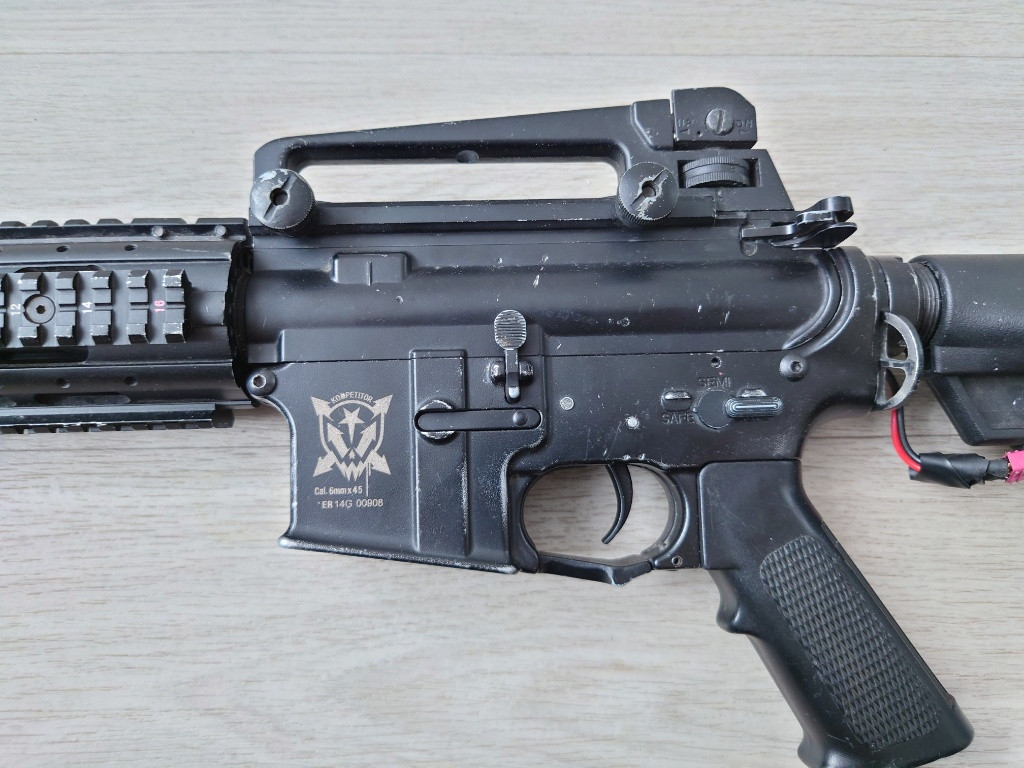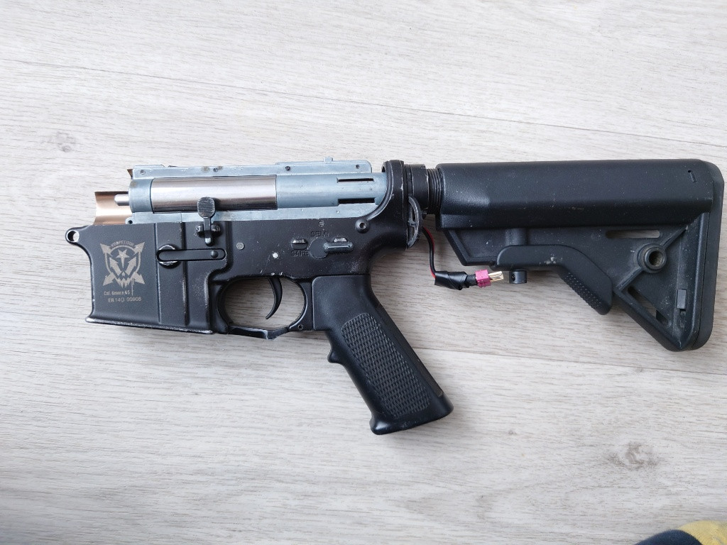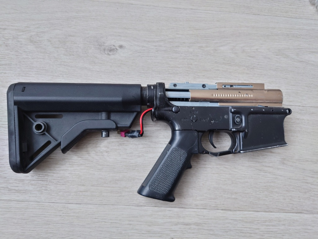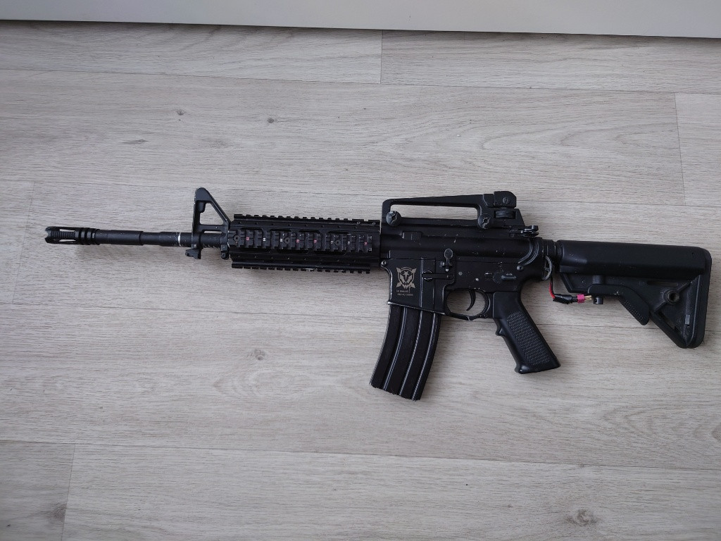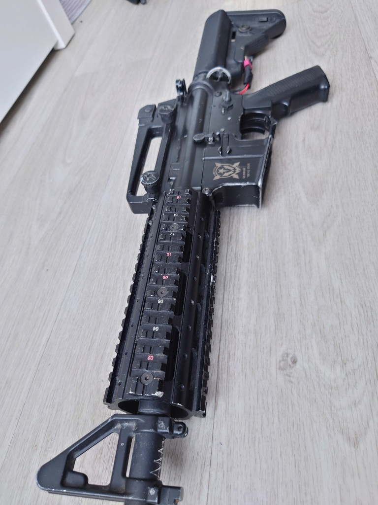 Prodám hranou APS M4 třetí generace. Uvnitř odlehčený píst s kovovými zuby, protitlaká hlava od RA, hliníková tryska, chromovaný válec, trn s ložiskem, guarder 120tka pružina, zesílený mechabox s rychlovýměnou pružiny. Každopádně aktuálně nefunkční, bylo by potřeba udělat alespoň kabeláž s přepínačem a aspoň hop gumu. V ceně jeden zásobník.
