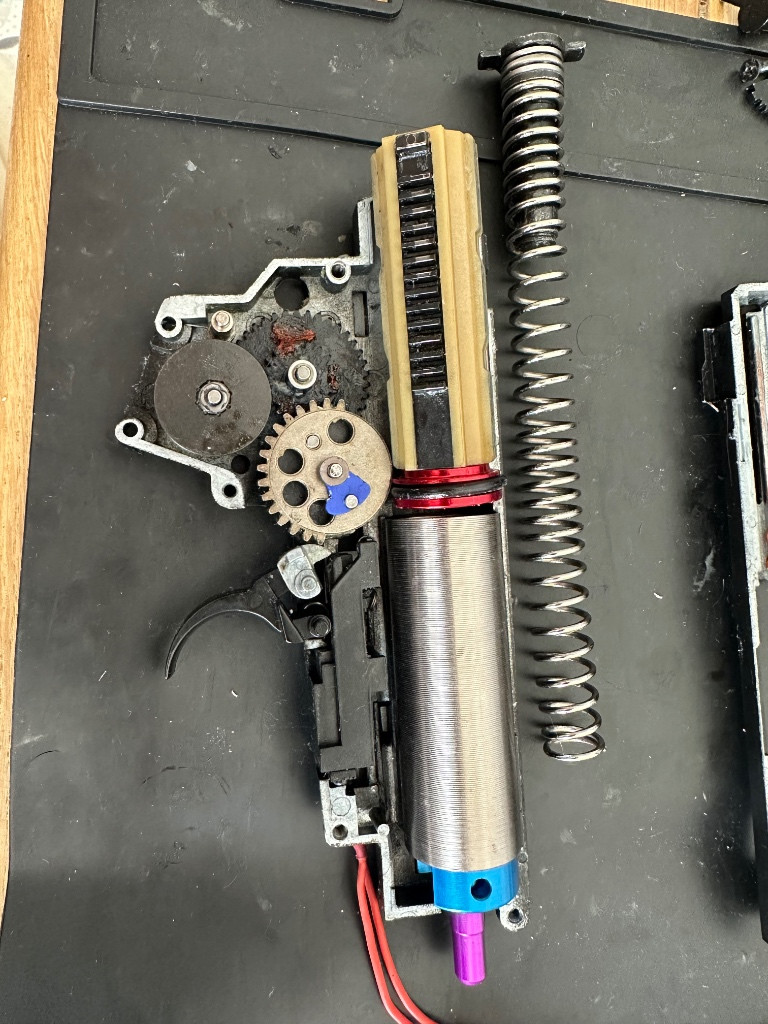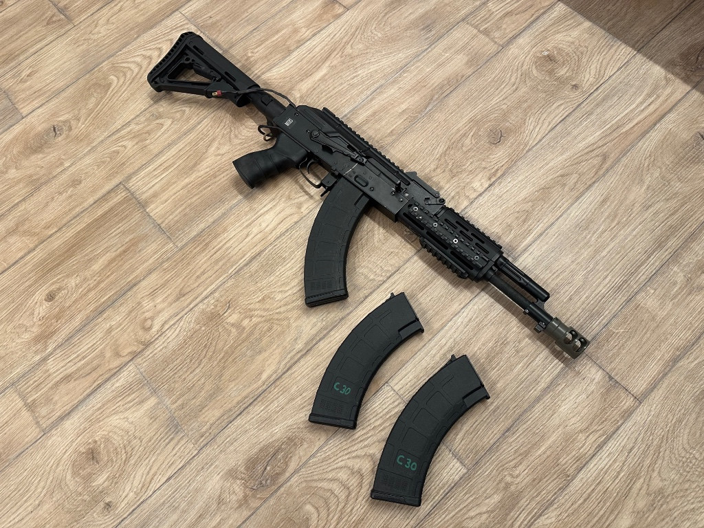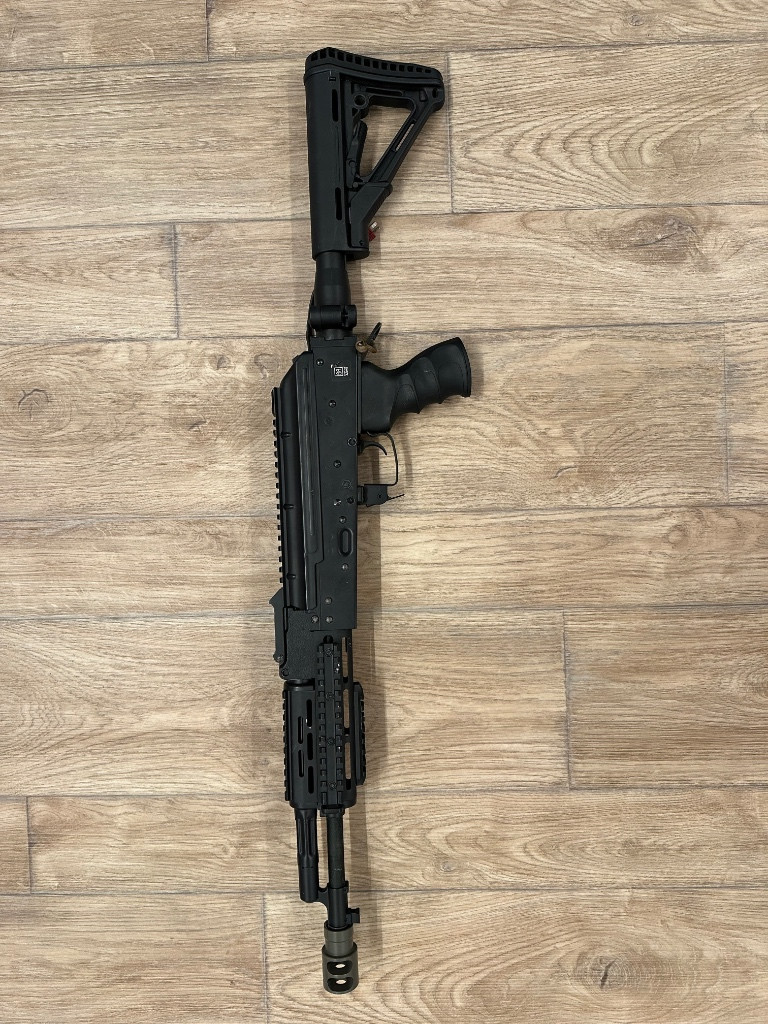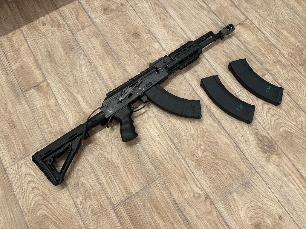 Zdravím, prodám své ak od specna arms je to celokov se sklopnou vysouvací pažbou. uvnitř se nachází mech od cymy kola shs 18:1, vačka shs, píst celokov zuby, hlava pístu shs, válec žebrovaný shs, hlava válce shs, tryska shs, pružina M130 GUARDER, motor Boost custom 40k, přesná hlaveň 6,02, MPL gumička, kompletní silikon kabeláž + mosfet. Zbraň disponuje stabilním výkonem 2,47j a 124m/s na 0,32g, u váhy 0,25g 2,6j 143m/s ke zbrani přidám 3x tlačné zásobníky nechám na zbrani i nový kompenzátor ( viz foto ) - když se při střelbě ( semi ) špatně domáčkne spoušť tak jen přecvakne je potřeba přehodit na full auto a poslat pár výstřelů. Já už s tím umím takže se mi to nestává tak často :D
