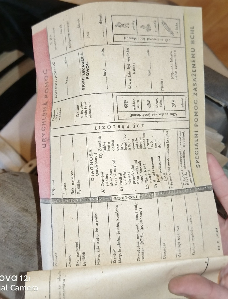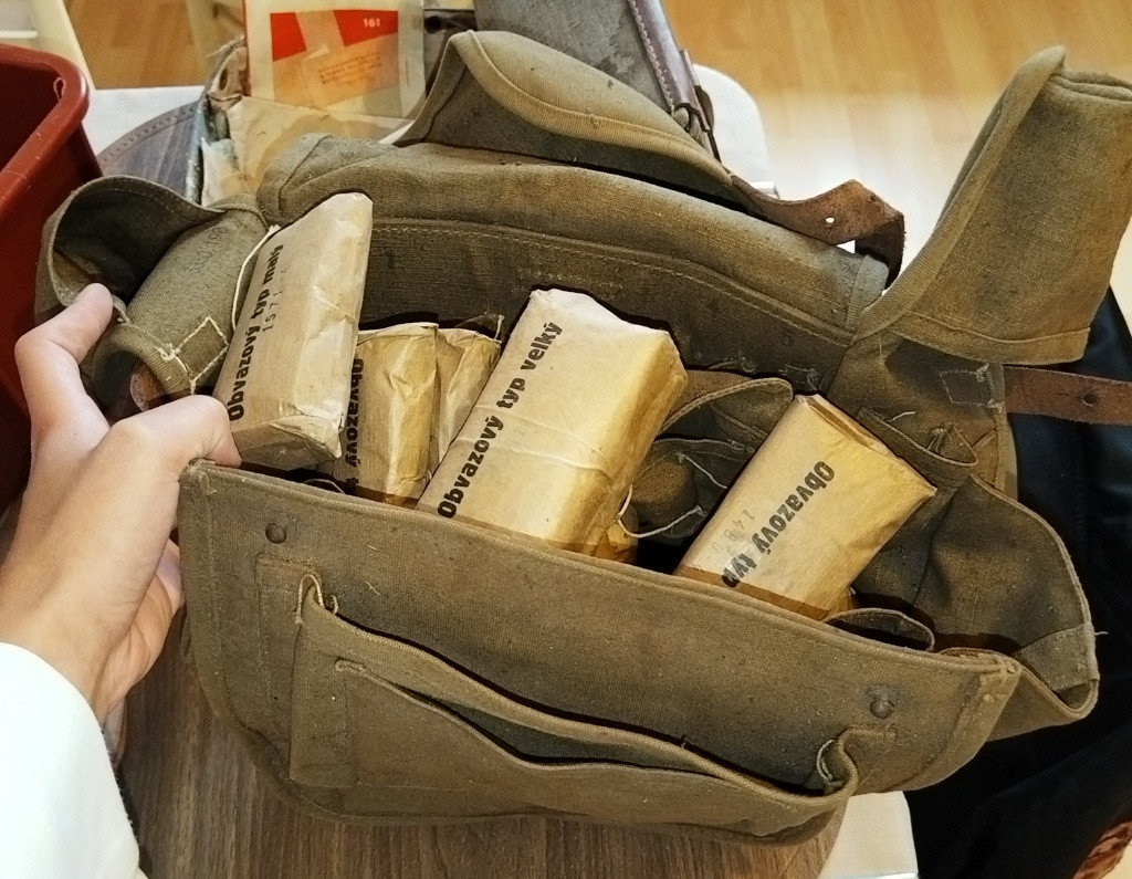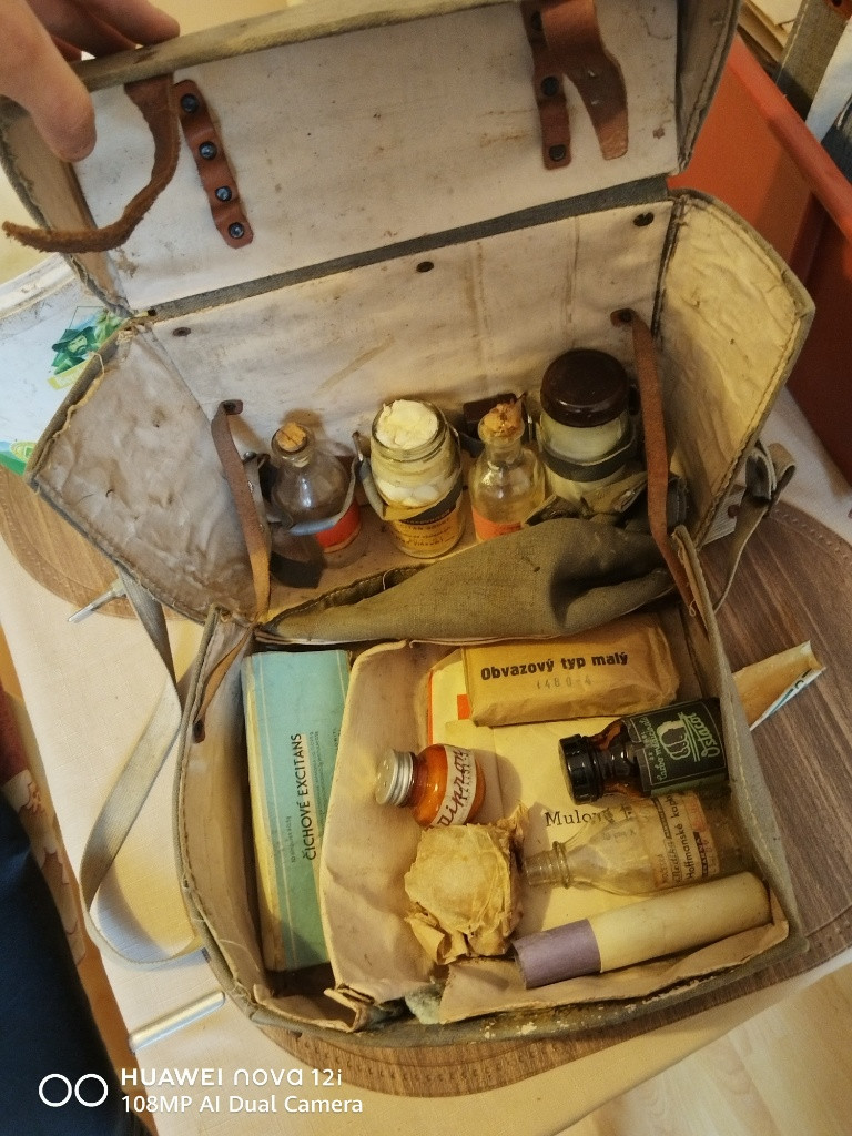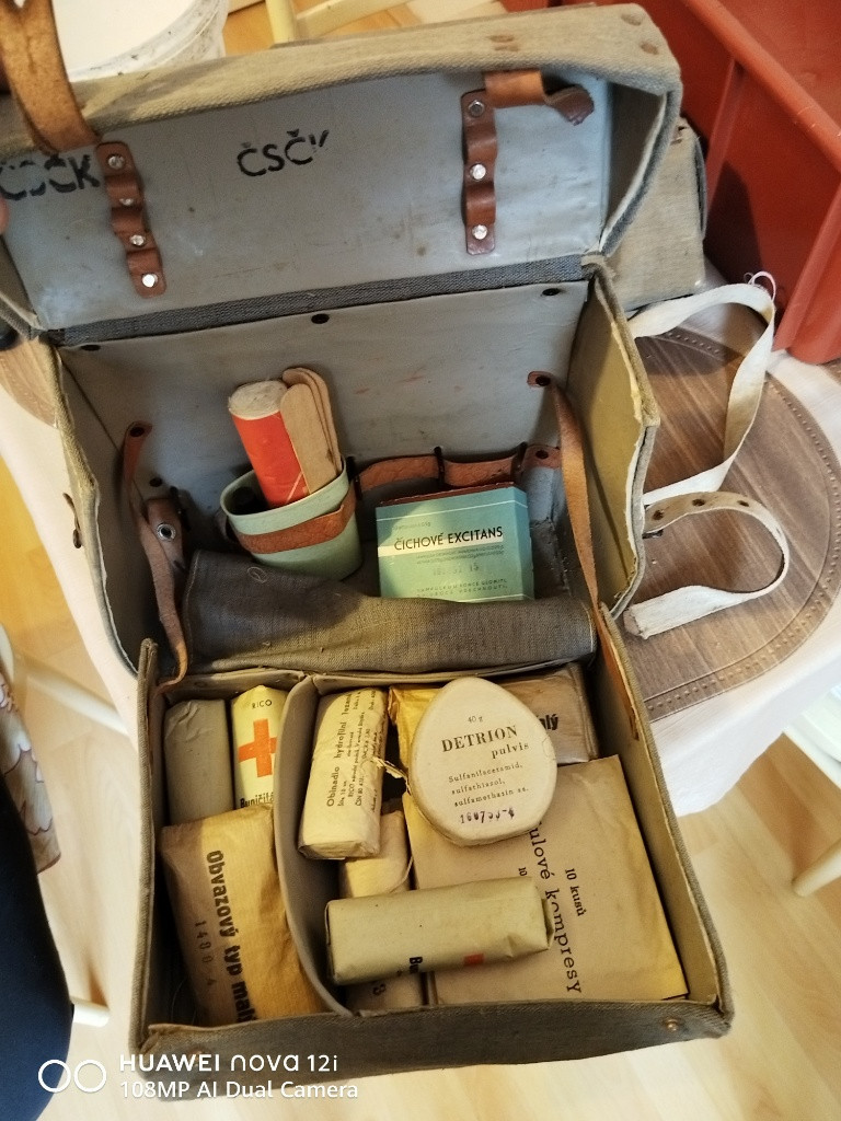 -2x kovový kufřík ČSČK (včetně originálního vybavení – obvazy, náplasti, ampule, staré pomůcky, zápisník urychlené pomoci…) -1x zásobovací zdravotnická taška s červeným křížem (plná originálně zabalených obvazů) další drobnosti (staré špendlíky, skleněné ampule, originální obaly…) Stav odpovídá stáří, zachovalé. Vhodné pro sběratele, muzeum nebo milovníky historie civilní obrany. Představu o ceně mám, ale ráda se domluvím dle zájmu a nabídky.