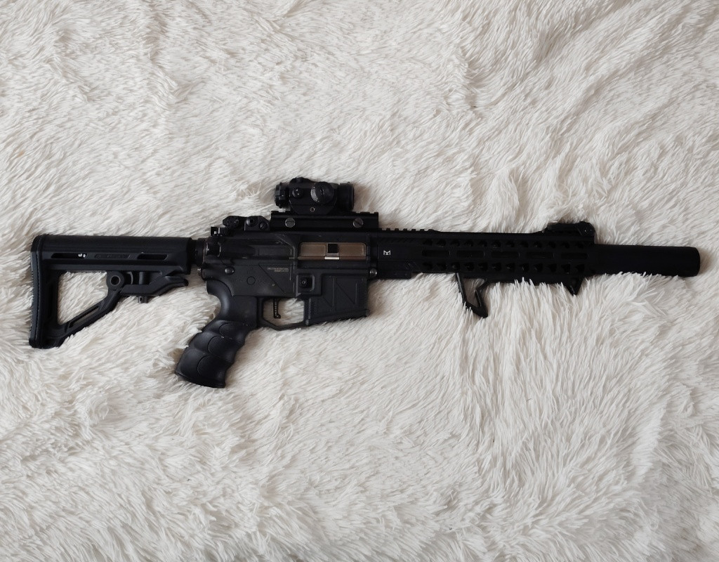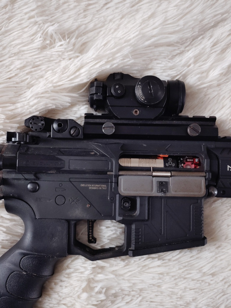 Prodám M4 v upgradu. Tělo je od Evolutionu, zesílený mechabox Specna Arms Aether, vnitřek komplet CNC dural- píst komplet kov ozubení Balystik, Hlava pístu AsPro, Hlava válce Balystik, tryska FpsSoftair, válec nerez 2/3 FpsSoftair, zátěžová kola, MAXX komora, guma 4Uantum, hlaveň nerez 6,02, zátěžový motor. Výkon 1,7J na 0,30 kulích, pružina M120 progresivní AsPro. Kolimator, Přední gryp.
