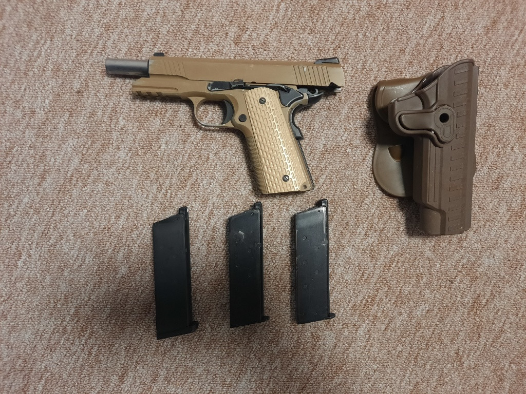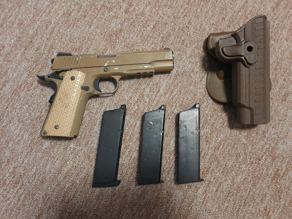 Airsoftová pistole Kimber Desert Warrior 5.1 WE, celokov, blowback, Green Gas, 3 zasobniky jeden treba přetěsnit plus plastové pouzdro na opasek. nejlépe vyměním za jinou záložku může být i aep glock nebo app-01 ... nebo za optiku,kolimator, cokoliv pište na whatsap nebo email...