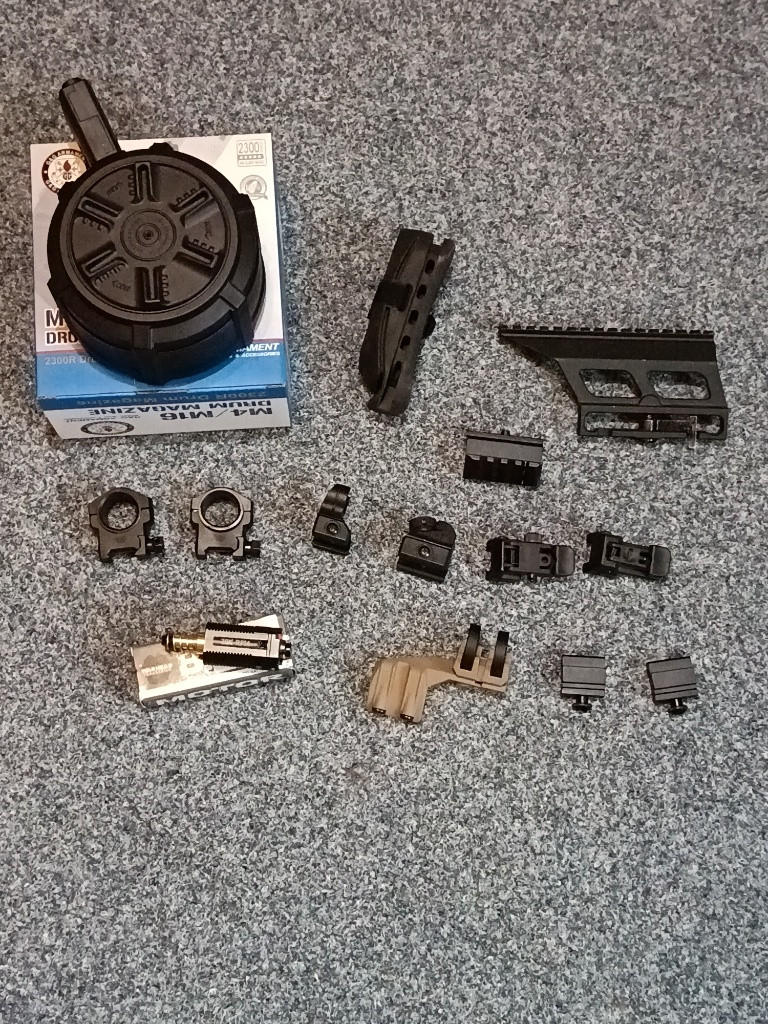 Prodám přebytky z upgradu G&G drum mag 1700, - Gumová botka pažby AK74 300, - Montáž optiky Svd/Ak 700, - Vector optics montážní kroužky 30/25 400,- E&C 202 originální mířila 100, - 45° offset montáž 100, - Asg sklopné mířidla 500, - Warhead motor 20k base dlouhá osa 2500, - Fma pravá montáž svitilny tan 200,- Redukce 22 ris na 11 ris 250,- Věci sou maximálně jednou použity. V případě zájmu jsem ochoten zaslat více fotek konkrétních věcí.