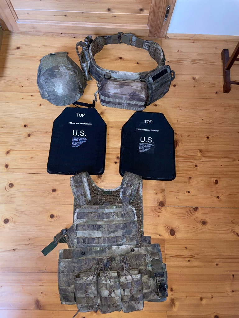 7. Balistická ochrana, pláty, 1ks cca2,5kg váha, šířka viz foto, cena za 2ks 5000,- 8. Opasek s doplňky, 2000,- , Helma MICH originální armádní 3000,- 9. Nosič balistických plátů vesta, 3500,- 10. Kalhoty vel. 50 a bunda vel. 52 clawgear, cena za oboje 3600,- 11. Funkční triko vel.M, klobouk vel. M, kukla vel.M, cena trika 1000,- , kloubouk - 150,-, kukla- 200,- 12. Batůžek - cena 1200,- 13. Set: balistické pláty, nosič balistických plátů, opasek s doplňky, helma, kukla, klobouk, triko, kalhoty, bunda, batuzek, cena Setu: 18 000,-