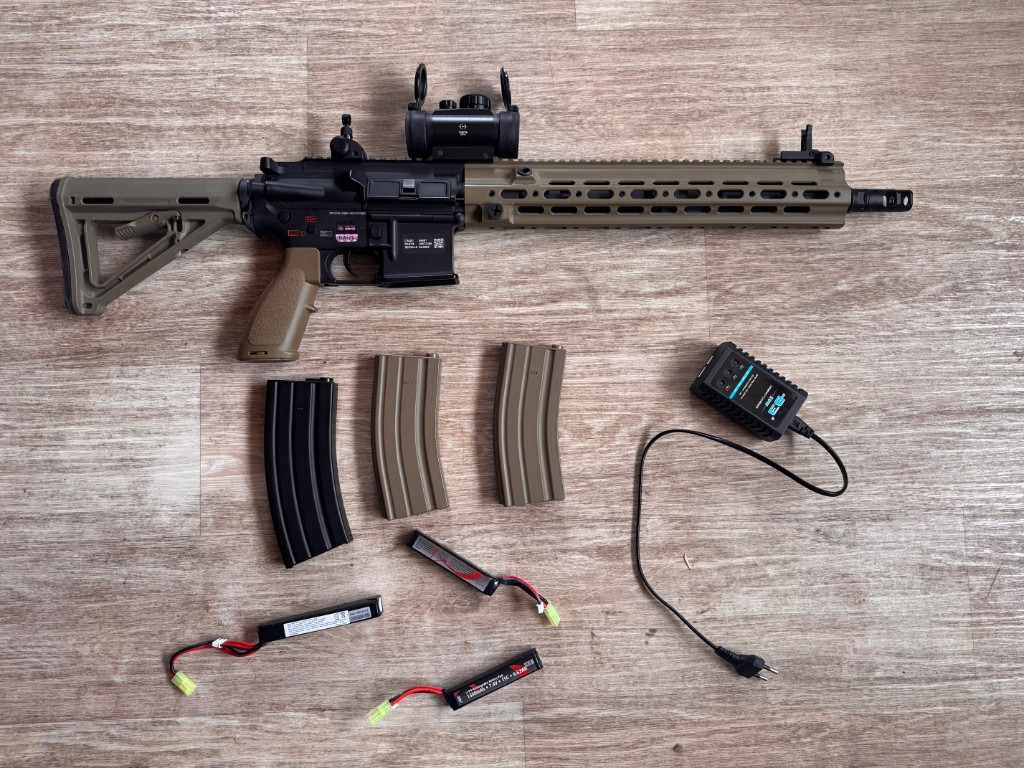 Dobrý den, prodám viz foto Specifikace: Výrobce Specna Arms, AEG elektrika, Úsťová rychlost (m/s): 125 m/s, Úsťová rychlost (fps): 410,10 fps, Energie kuličky (J): 1,56 J, Teoretický dostřel : 56,44 m, Váha 3000 Kg, Materiál celokov, Mechabox Verze 2 kovový zesílený, Motor zátěžový dlouhý, Ložiska 8mm, kovová klasické ozubení, doporučená váha kuliček 0.20g – 0,25g. Prodám komplet za 7000 Kč