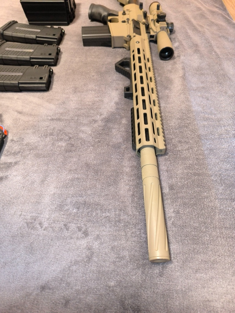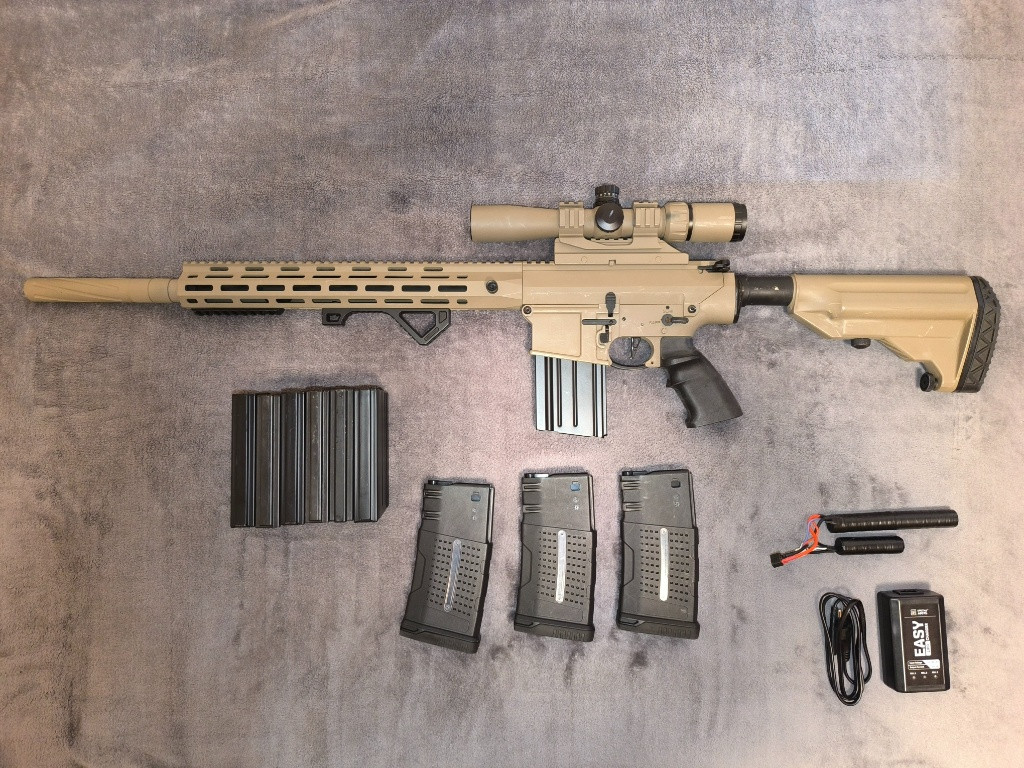 Ahoj. Prodám SR25 Specna Arms, kupovaná v letě v Ananasu. Vnitřní kompletní mechabox RA,(píst, válec,hlava,hlava pístu, pružina 120, ložiska kluzná 4mm,tryska, ozubená kola Pandora 4mm 19 zubů) komplet vše Retro Arms. Řídicí jednotka JeffTron Scyla V2, motor ASG Infinity 22k,Hop komora RA, hlaveň 6.01-510mm,Puškohled Theta optic 3-9x40BE, Přidám 10 zásobníků,baterii Titan 11.1-3000mAh, základní nabíječku Specna Arms, balík kuliček 0.40g, Pružinu RA140, naměřené hodnoty z 0,40 na 120-2,6J a na 140-3,5J. Zbraň je stříkaná Coyote.