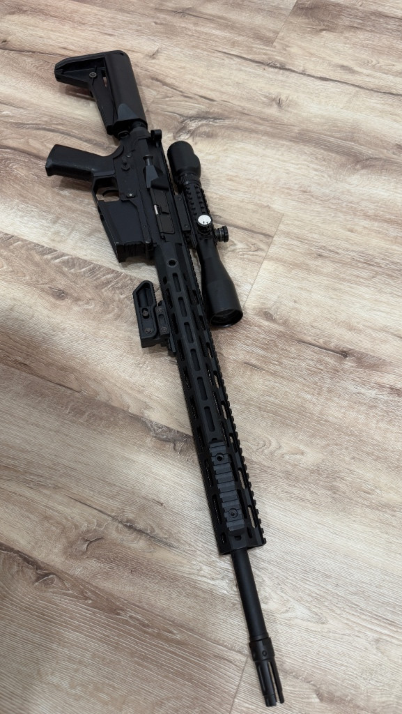 Prodám airsoftovou DMR SR25 Cyma Platinum CM.098B (URX4 M-LOK 16”, černá) Elektrická airsoftová puška ve velmi pěkném stavu, hraná maximálně na 2 akcích. Kvalitní Cyma Platinum edice – kovové tělo, QSC (rychlá výměna pružiny), ETU + MOSFET, skvělá odezva na spoušť. Ideální DMR. Součástí setu: • 4 zásobníky (3× tlačný, 1× točný) • 2× baterie NiMH 9,6V / 1600 mAh + inteligentní nabíječ • Optika 3–9x40 (bez přísvitu, plně funkční) • Sklopná rukojeť, RIS lišty, popruh, sklopné mířidla Prodávám jako kompletní set – stačí nabít a hrát. Důvod prodeje: nevyužití. Pouze 18+