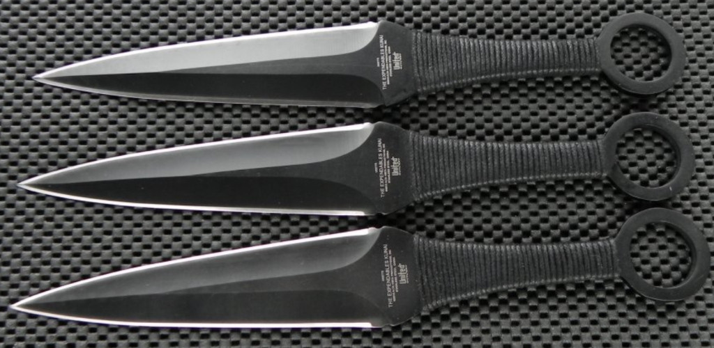Prodám použité vrhací nože UC2772 United The Expendables Kunai v perfektním stavu. Originální replika nožů použitých ve filmu Expandables. Jsou vyrobeny z jednoho kusu anodizované oceli. Délka: 30,5 cm - double edge. Součástí je pevné pouzdro které lze zajistit popruhem s pojistkou okolo stehna. K dispozici jsou 2 sady po 3 ks nožů. Prodám buď jednu sadu za 1.000,- Kč nebo obě najednou za 1.900,- Kč