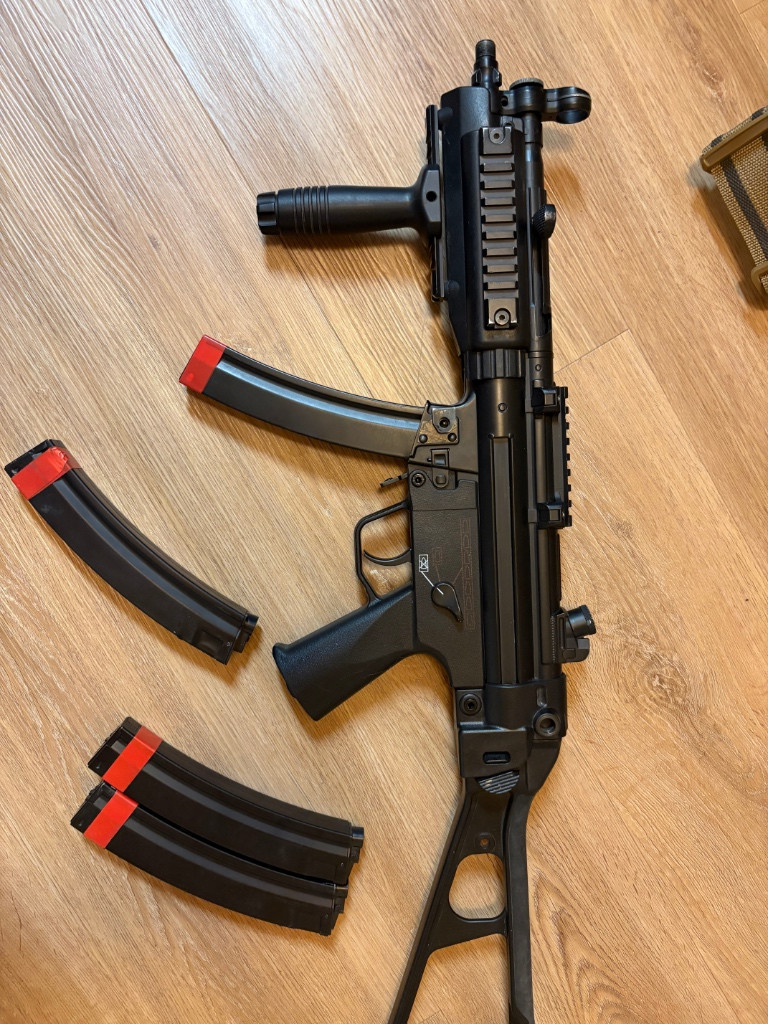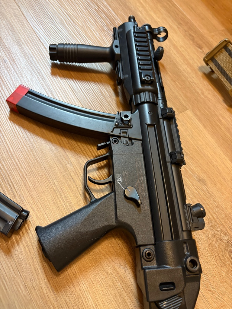 prodávám používanou mp5 je v základu a má 100M pružinu takže dává 1J kvůli CQB, stačí vyměnit pružinu pro více J. má CNC píst a má 3,5kg určeno spíš pro začátečníky nebo jako sběratelský kus k tomu 2 točný zásobníky a 2 tlačný pište na WhatsApp 775 573 978