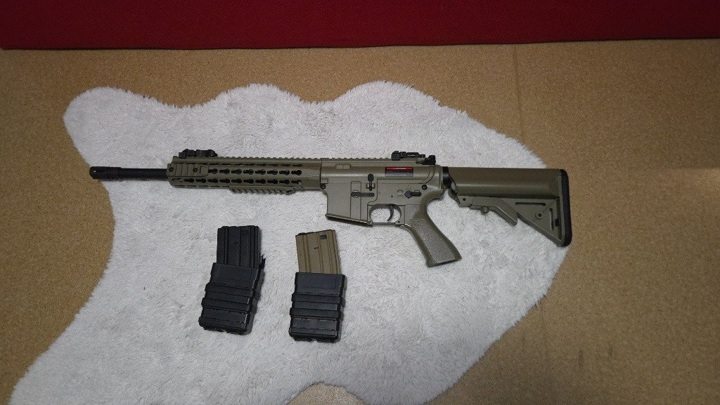 Zahrnuje: Zbraň (M4 Keymod 10” Sportline (CM.515) - TAN), 2 zásobníky kovové high capacity na 350 kuliček, 2 polymerové a gumové pouzdra na zásobníky 2 balení kuliček 4000ks (jedno je nové a jedno je otevřené a cca 150 kuliček chybý) 1 plnička zásobníků 1 úplně nová výkonná nabíječka 1 starší náhradní nabíječka 1 nový výkonný NiMH akumulátor 1starší náhradní akumulátor + Všechny potřebné kabely k nabíječkám i akumulátorům 1 nová (jen otevřená) kukla s chráničem na pusu 1 nové ochranné brýle s možností mít pod nimi brýle dioptrické Cena všecho úplně nového 5850Kč Na ceně je možnost smlouvat :)