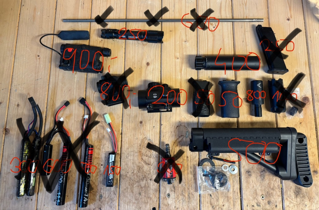 Dobrý den, prodám vše co je na foto. Vše funkční některé kousky striknute barvou ale při zájmu poskytnu info ke každému kusu zvlášť. Při velkém odběru lepsi cena. - baterie Titan prodaný - acetech nasvětlovací tlumič prodaný - baterie za 300 prodaná - hlaveň prodaná - motor prodán - zásobník prodán