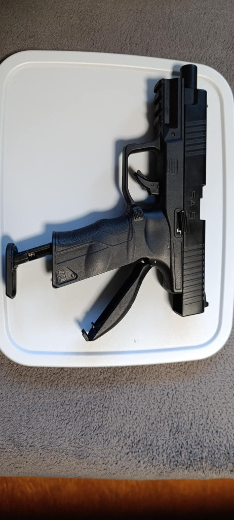 Prodám 1x plynovou pistoli Umarex SA9 4.5mm, 177. (Nutno vyměnit zasobnik kulicky nedrží v zásobníku pružina je vyhazuje) 1x Umarex T4E cal 50. Plně funkční vystřeleno max 4 zásobníky. Prodám jako celek. Vše co je na foto. 2 pistole ke každé jeden zasobnik plus dvě bombicky a k T4E asi 200 gumových projektilu. V případě dotazů pište SMS na číslo a já zavolám. Cena pevná.
