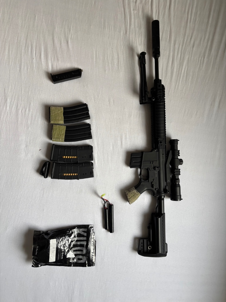 Dobrý den prodám svou Airsoftovou pušku CM.612, M4 UX, Nylon - Black [CYMA] a příslušenství. Příslušenství zahrnuje: Bipod, tlumič, LPVO 4xzoom puškohled, vysoce kvalitní držák na LPVO, 4x normální zásobník, 1x malí zásobník, plnička, 3x čističe hlavně v různé velikosti, 2x nabíječka, kuličky a taška na zbraň (baterka na obrázku je přímo ze zbraňe). Vše je ve velmi dobrém stavu, akorát je ulomená malá část spodní lišty na před bipodem. V případě zájmu můžete napsat i na Instagram Ig: @_zabiakk_ ‼️JE MOŽNO SMLOUVAT O CENĚ‼️