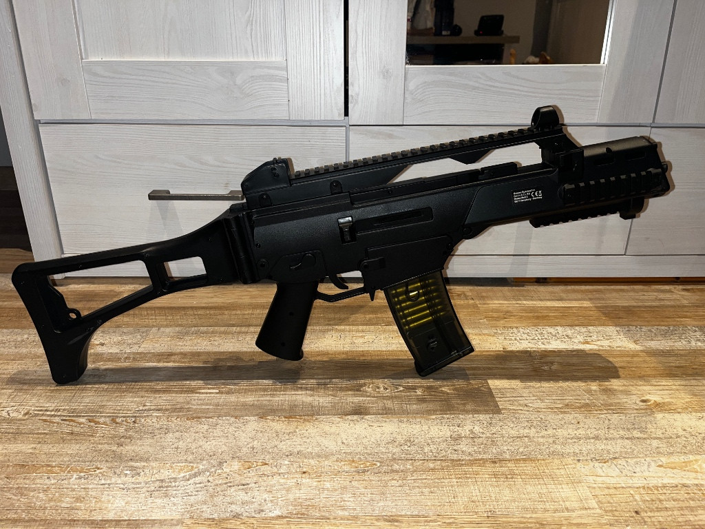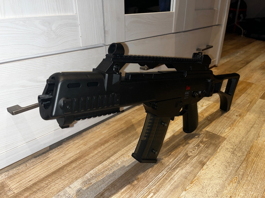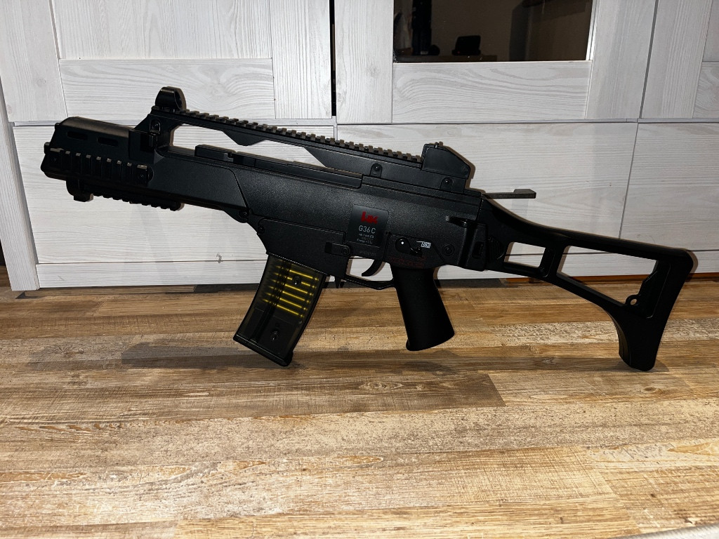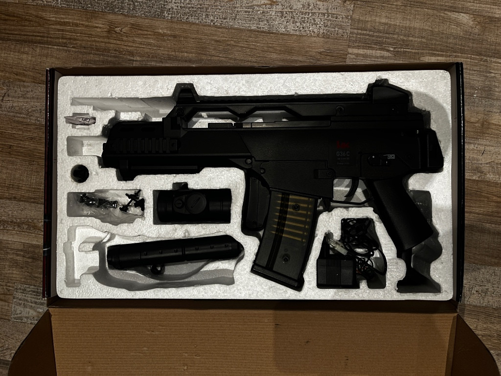 Prodám elektrickou airsoftku Heckler & Koch G36C AEG, kalibr 6 mm BB. Cena: 1 500 Kč - dohodou Hned na začátek uvádím: na přední části má menší poškození – část hlavně je ulomená. Zbraň ale normálně střílí a na běžné používání to podle mě nemá vliv. Prodávám ji hlavně proto, že už airsoft nehraju a doma mi jen leží nevyužitá. Součástí je základní příslušenství ze setu: – zbraň H&K G36C – zásobník – baterie + nabíječka – kolimátor – tlumič – popruh - ruční držadlo – originální krabice Navíc k tomu přihodím ještě: – ochrannou masku – BB kuličky Ideálně osobní předání Ústí nad Labem/Praha