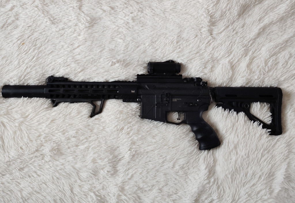 Prodám M4 v upgradu. Tělo je od Evolutionu, zesílený mechabox Specna Arms Aether, vnitřek komplet CNC dural- píst komplet kov ozubení Balystik, Hlava pístu AsPro, Hlava válce Balystik, tryska FpsSoftair, válec nerez 2/3 FpsSoftair, zátěžová kola, MAXX komora, guma 4Uantum, hlaveň nerez 6,02, zátěžový motor. Výkon 1,7J na 0,30 kulích, pružina M120 progresivní AsPro. Kolimator, Přední gryp.