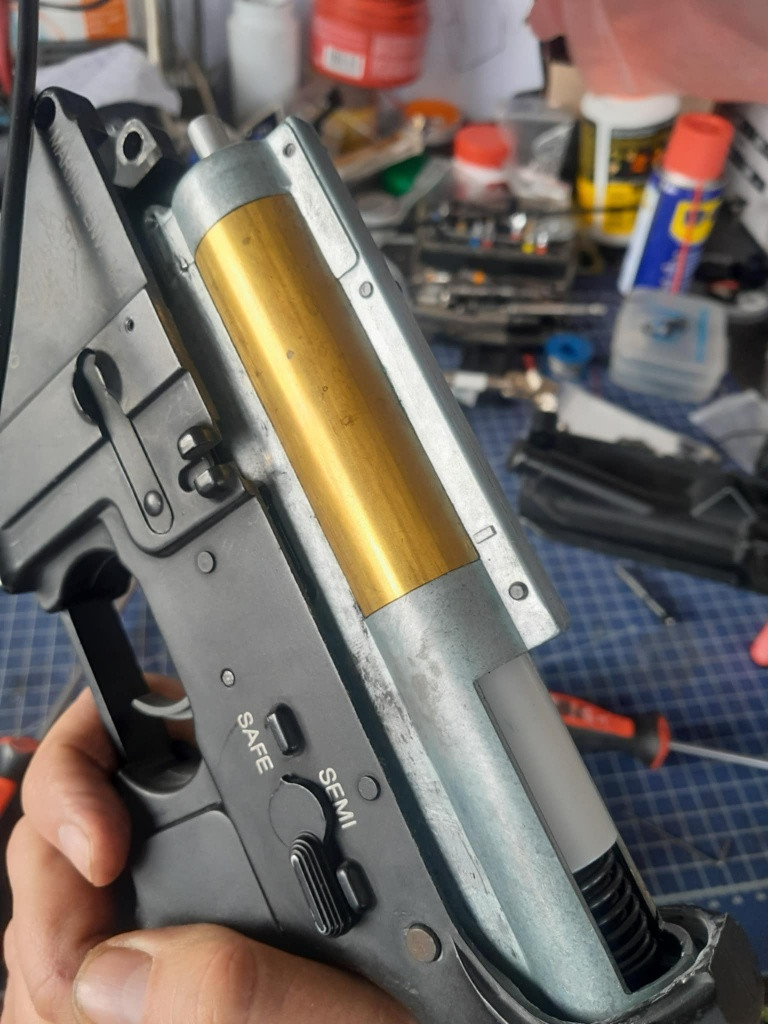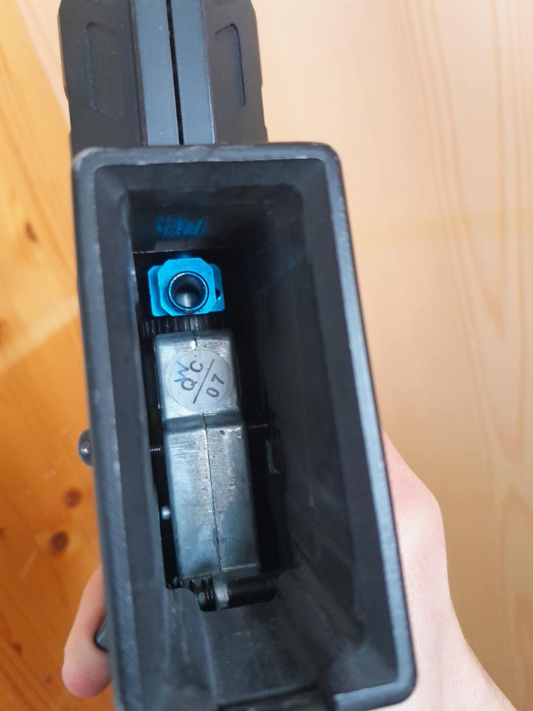 Prodám čtverku od GP s předpažbím od DA. Uvnitř QC mechabox od GP s mikrospínačem. Díly mechaboxu GP základ, jen vyměněna tryska tuším za RA. Motor GP. Tělo nelícuje tak pěkně, viz foto, asi páteční/pondělní kus. Mírná vůle mezi lowerem a upperem byla vymezena Magicpinem. Hlaveň mosaz, hopkomora ProWin, gumu nevím. Mechabox dostředěný vůči komoře šrouby z boku těla viz foto. Součástí průhledový kolimátor typu Aimpoint CompM2 . Výkon zbraně naladěn na pláckobitky 1,55 Joule na 0,30 BB. Kabeláž origo GP a osazen Dean-T konektor.