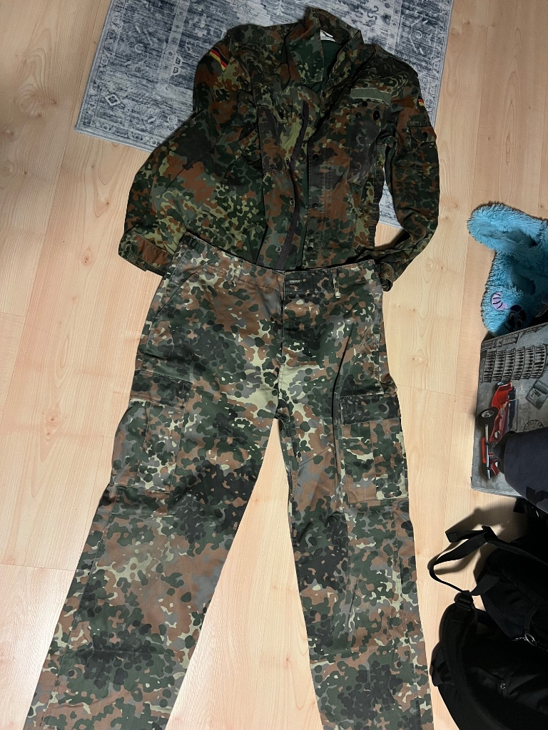 Zdravím, prodám německé maskáče. Taktická košile je helikon tex zbytek je originál armády Německa. Velikost tak na 180+cm člověka. Při rychlém jednání přidám kuklu a klobouk v maskáči flecktarn