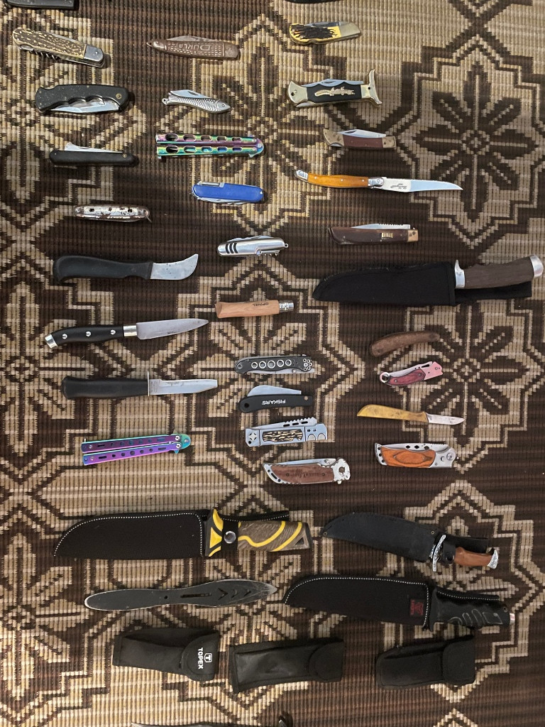 Dobrý den prodám tyto nože, nejlépe všechny dohromady ale lze koupit po jednom. Malý kapesní nůž 200-,velký s pevnou čepelí 400-, k tomu ještě 3 pouzdra jedno za 50-, jestli máte vážný zájem napište si o další fotky. Jen pro vážné zákazníky, při odevzdání chci vidět nějaký průkaz ze bylo minimálně 15 a svolení od rodičů a od 18 pochopitelně taky průkaz