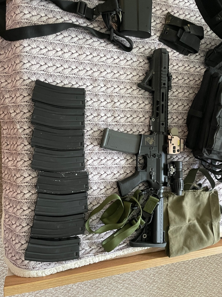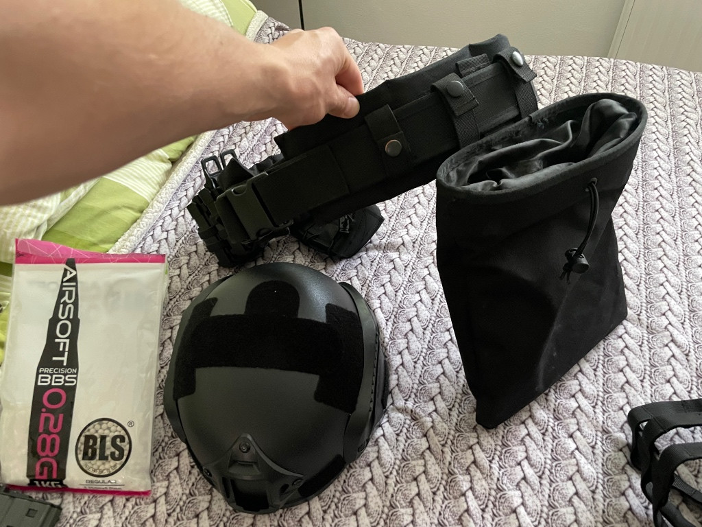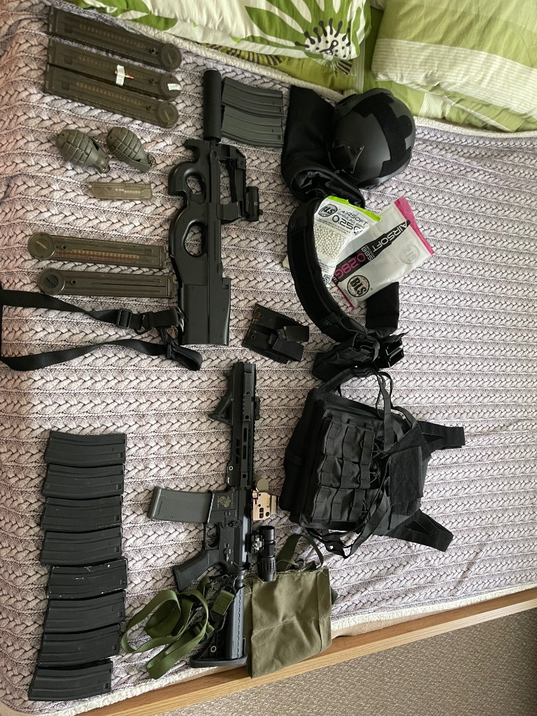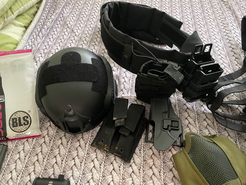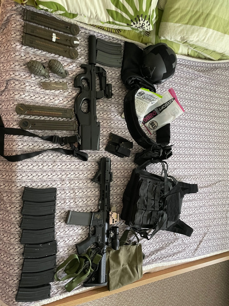 Za nějakou chvíli hraní se mi doma pohromadila hramadka pár věcí které už z důvodu casu nevyužiji. Proto prodávám jako komplet a někomu to ještě poslouží na začátek ideal bych tak řekl, nebo doplnit výbavu stávající. Zbraň m4 servis byl proveden a na 0.28 to ma 1.7J samozřejmě funkční optika vše co je na fotkách k tomu. P90 jsem akorát koupil a nechal udělat novou elektriku plus tlumič a snížil výkon na 1.3J akorát pružina slabší, pak jedna hra a jinak doma ve skříni. Vesta sumky pasek vše co je na foto přidávám k tomu, o ceně jsem ochotný jednat na místě, samozřejmě stalo to mnohem víc ale toto jsou věci které dělají radost tak proto posílám dále.